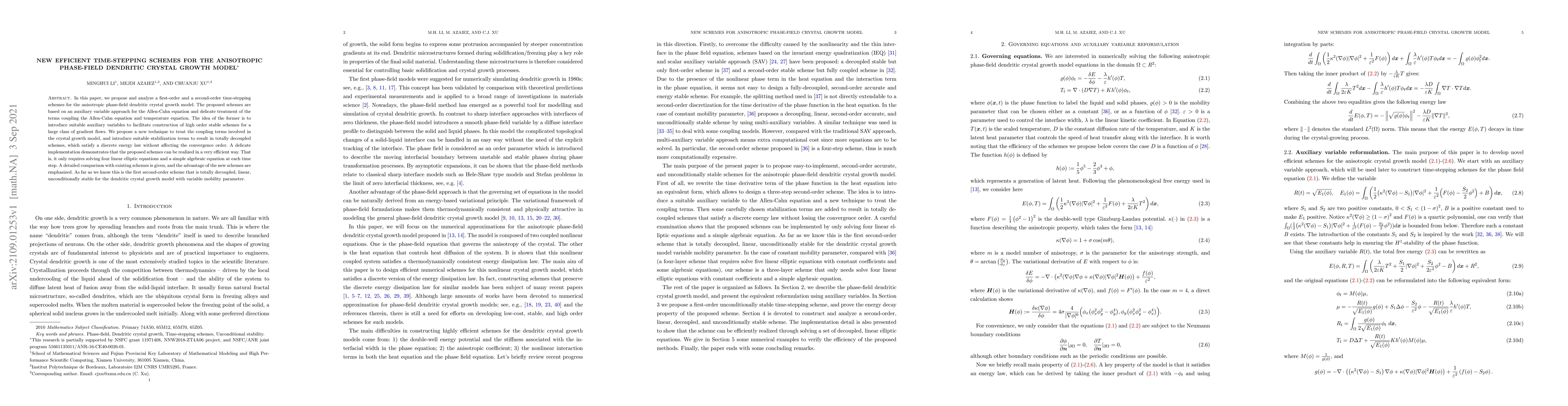 This paper proposes first-order and second-order time-stepping schemes for the anisotropic phase-field dendritic crystal growth model, introducing auxiliary variables and stabilization techniques to achieve decoupling and efficiency. The new schemes are linear, unconditionally stable, and require only four linear elliptic equations and a simple algebraic equation per time step.