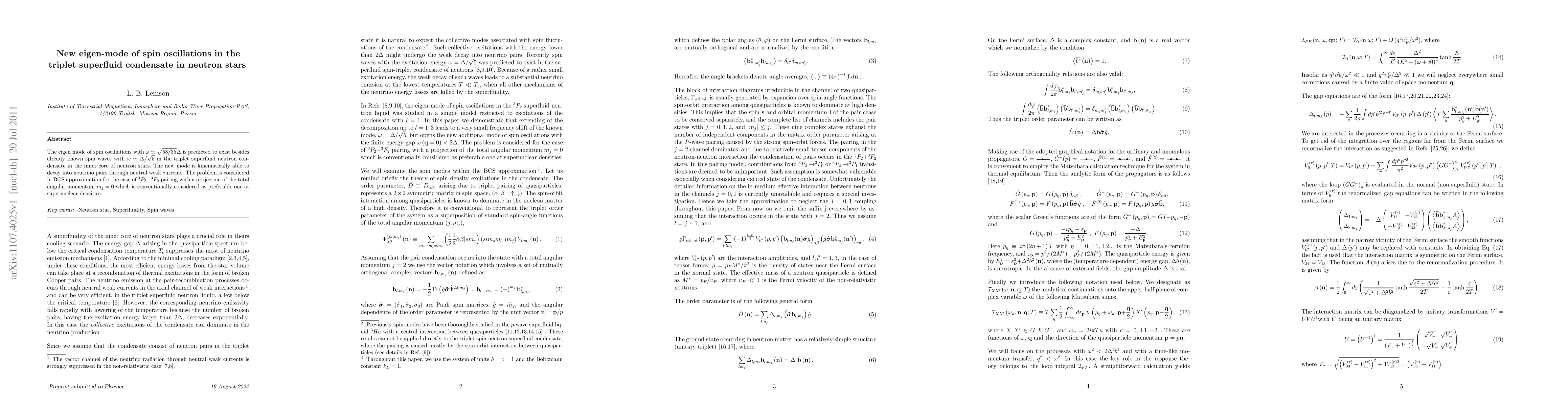 The eigen mode of spin oscillations with $\omega\simeq \sqrt{58/35}\Delta$ is predicted to exist besides already known spin waves with $\omega \simeq\Delta /\sqrt{5}$ in the triplet superfluid neutron condensate in the inner core of neutron stars. The new mode is kinematically able to decay into neutrino pairs through neutral weak currents. The problem is considered in BCS approximation for the case of $^{3}P_{2}-^{3}F_{2}$ pairing with a projection of the total angular momentum $m_{j}=0$ which is conventionally considered as preferable one at supernuclear densities.