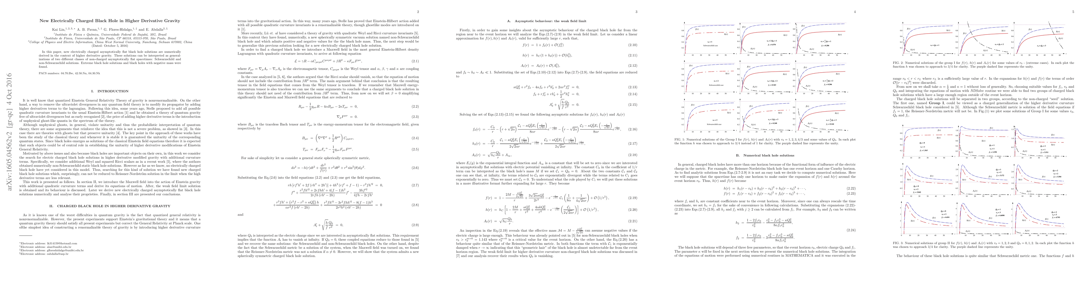 This paper numerically derives new electrically charged asymptotically flat black hole solutions in higher derivative gravity, extending Schwarzschild and non-Schwarzschild spacetimes, and identifies extreme black holes and negative mass black holes.