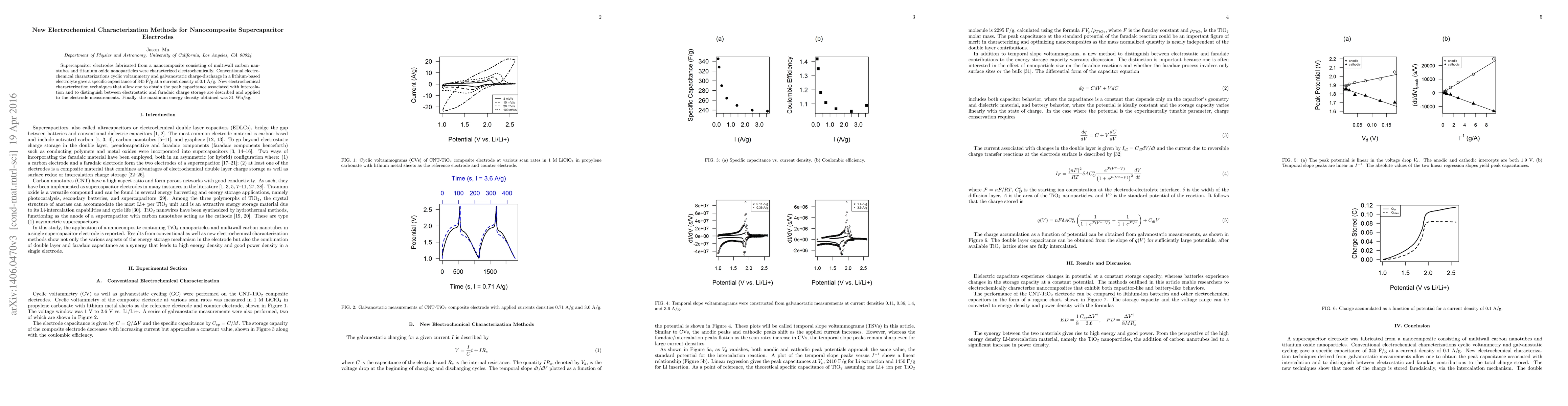 This paper introduces novel electrochemical methods to characterize nanocomposite supercapacitor electrodes made from multiwall carbon nanotubes and titanium oxide nanoparticles, achieving a specific capacitance of 345 F/g and a maximum energy density of 31 Wh/kg. These new techniques distinguish between electrostatic and faradaic charge storage.