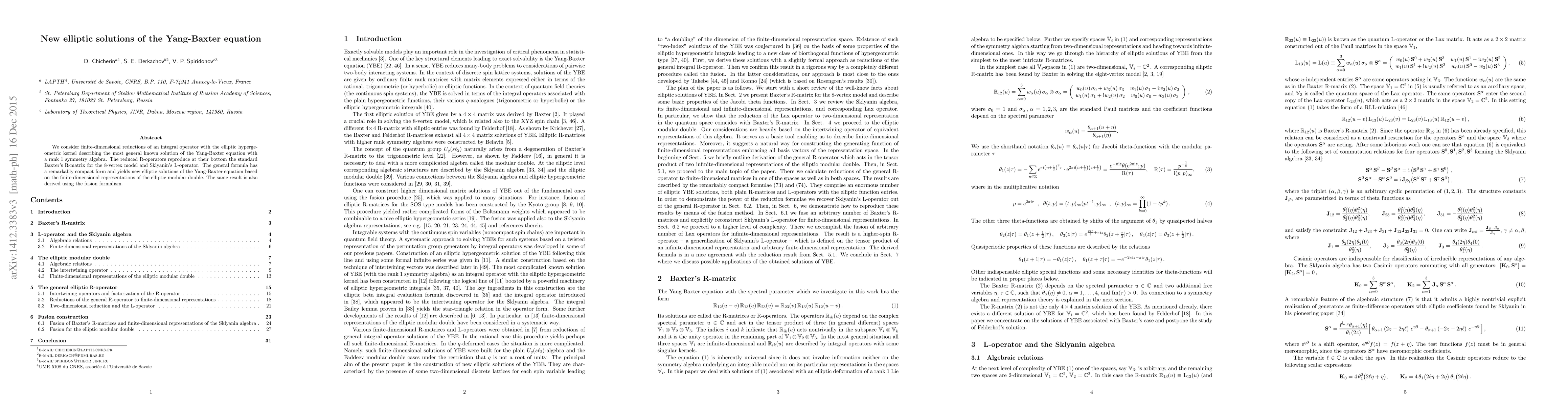 This paper presents new elliptic solutions to the Yang-Baxter equation through reductions of an integral operator with an elliptic hypergeometric kernel. It shows these solutions are derived from finite-dimensional representations of the elliptic modular double and coincide with Baxter's R-matrix and Sklyanin's L-operator.