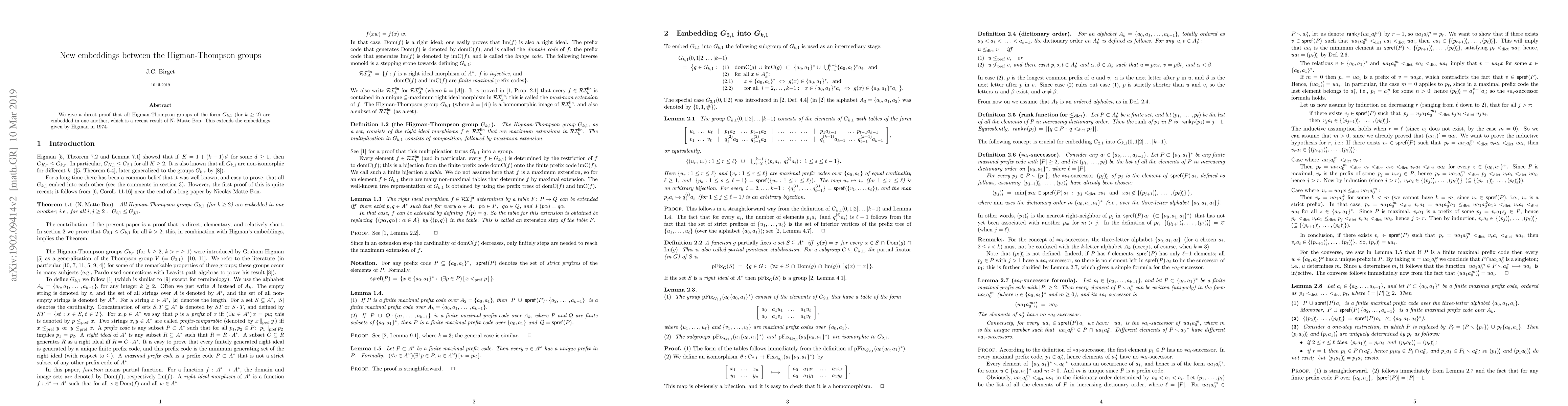 Summary: This paper provides a direct proof that all Higman-Thompson groups $G_{k,1}$ for $k \ge 2$ are embedded in each other, extending previous embeddings established by Higman in 1974 and confirming a recent result by N. Matte Bon.