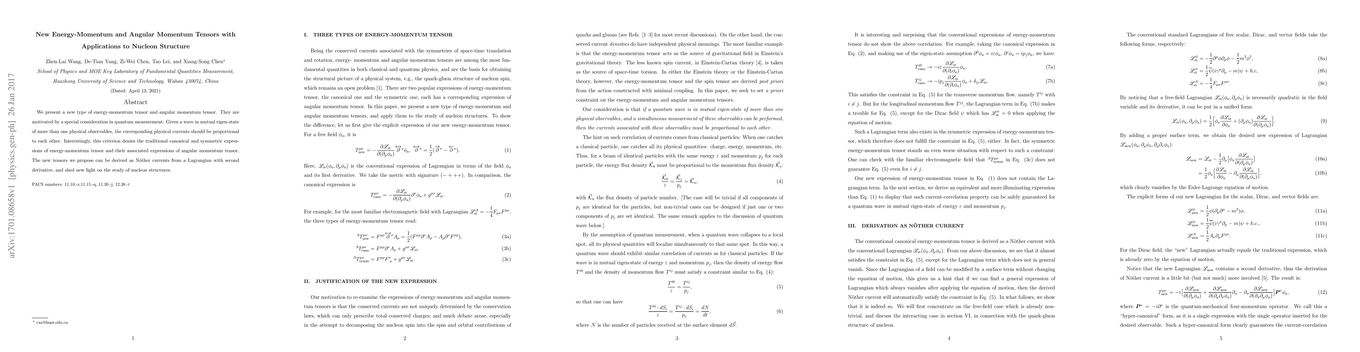 This paper introduces novel energy-momentum and angular momentum tensors derived from a Lagrangian with second derivatives, motivated by quantum measurement considerations. These tensors offer new insights into nucleon structures, differing from traditional canonical and symmetric forms.
