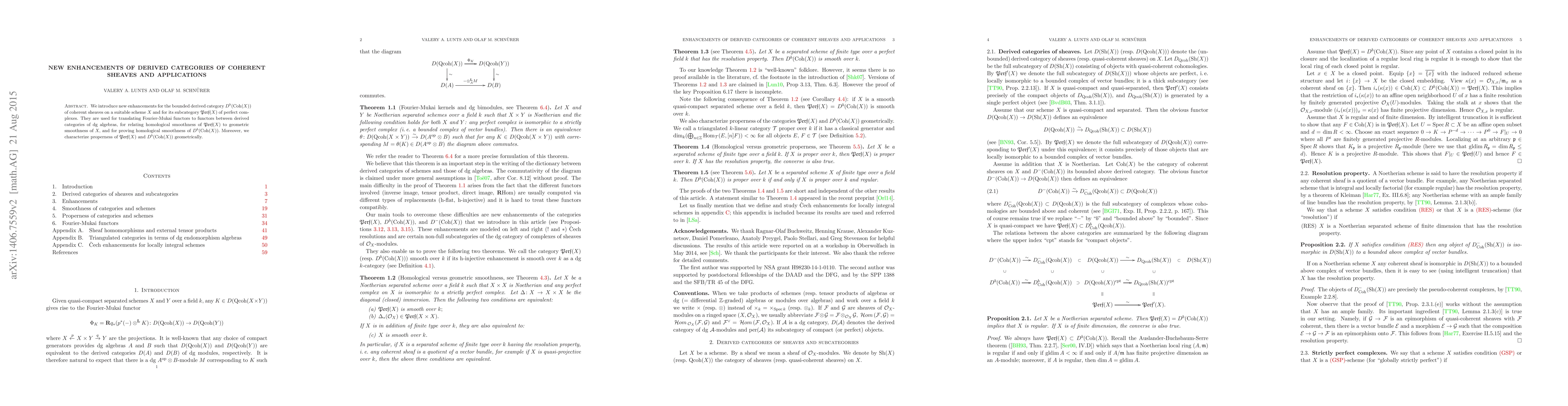 This paper introduces enhancements for the derived category of coherent sheaves on a scheme and its subcategory of perfect complexes. These enhancements enable translations of Fourier-Mukai functors, relate homological smoothness to geometric smoothness, and establish the homological smoothness of the derived category. Additionally, it characterizes the properness of these categories geometrically.