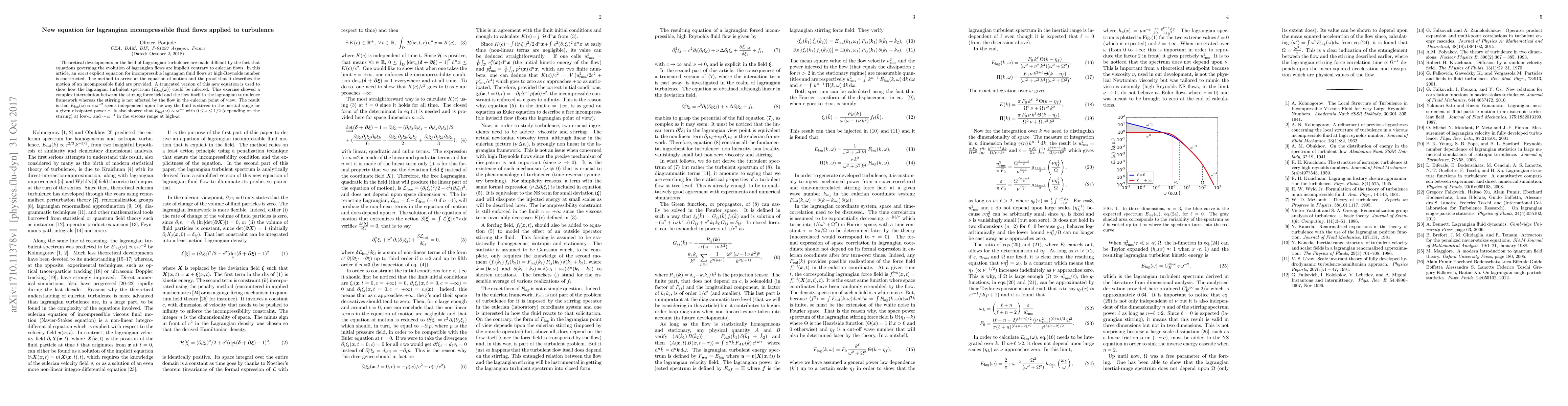 Theoretical developments in the field of Lagrangian turbulence are made difficult by the fact that equations governing the evolution of lagrangian flows are implicit contrary to eulerian flows. In this article, an {\it exact} explicit equation for incompressible lagrangian fluid flows at high-Reynolds number is constructed. The method to arrive at the equation of motion and the proof that it describes the motion of an incompressible fluid are provided. A truncated version of this new equation is used to show how the lagrangian turbulent spectrum ($E_\mathrm{lag}(\omega)$) could be inferred. This exercise showed a complex interrelation between the stirring force field and the flow itself in the lagrangian turbulence framework whereas the stirring is not affected by the flow in the eulerian point of view. The result is that $E_\mathrm{lag}(\omega)\propto \varepsilon\,\omega^{-2}$ seems independent upon the way the fluid is stirred in the inertial range for a given dissipated power $\varepsilon$. It also showed that $E_\mathrm{lag}(\omega)\sim \omega^{-s}$ with $0\leq s\leq 1/2$ (depending on the stirring) at low-$\omega$ and $\sim\omega^{-4}$ in the viscous range at high-$\omega$.