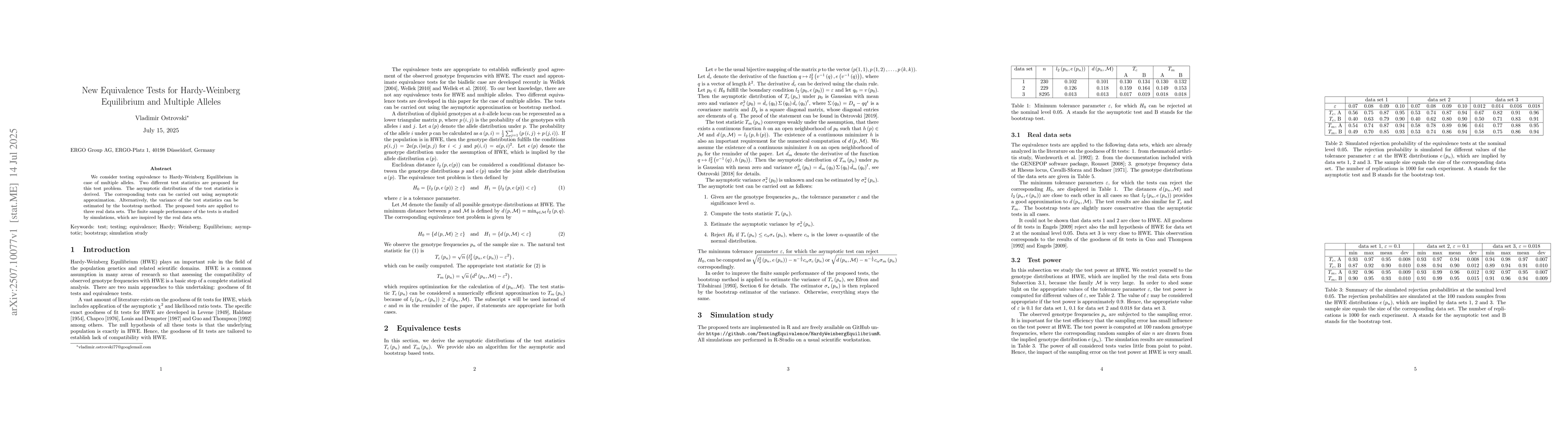 We consider testing equivalence to Hardy-Weinberg Equilibrium in case of multiple alleles. Two different test statistics are proposed for this test problem. The asymptotic distribution of the test statistics is derived. The corresponding tests can be carried out using asymptotic approximation. Alternatively, the variance of the test statistics can be estimated by the bootstrap method. The proposed tests are applied to three real data sets. The finite sample performance of the tests is studied by simulations, which are inspired by the real data sets.