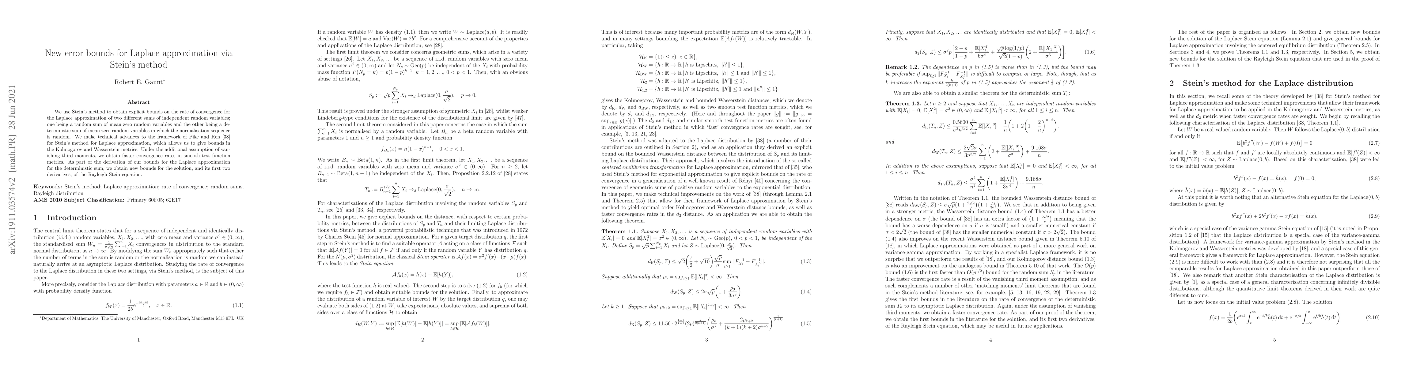 This paper employs Stein's method to derive explicit error bounds for the Laplace approximation of two types of sums of independent random variables, achieving improved convergence rates under certain conditions. It also provides new bounds for the Rayleigh Stein equation and its derivatives.