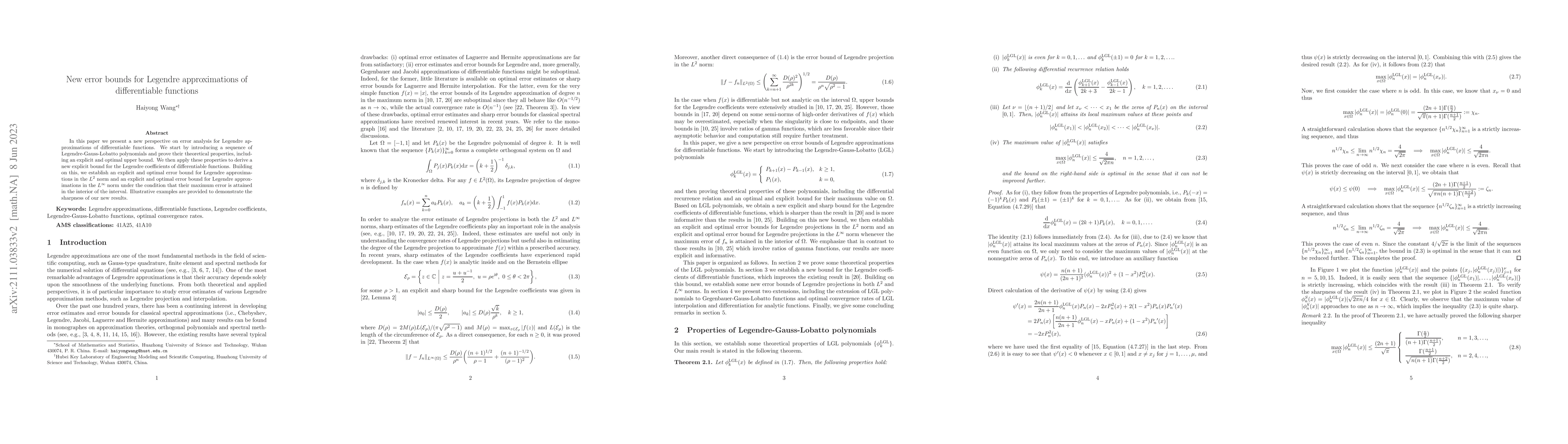 In this paper we present a new perspective on error analysis of Legendre approximations for differentiable functions. We start by introducing a sequence of Legendre-Gauss-Lobatto polynomials and prove their theoretical properties, such as an explicit and optimal upper bound. We then apply these properties to derive a new and explicit bound for the Legendre coefficients of differentiable functions and establish some explicit and optimal error bounds for Legendre projections in the $L^2$ and $L^{\infty}$ norms. Illustrative examples are provided to demonstrate the sharpness of our new results.