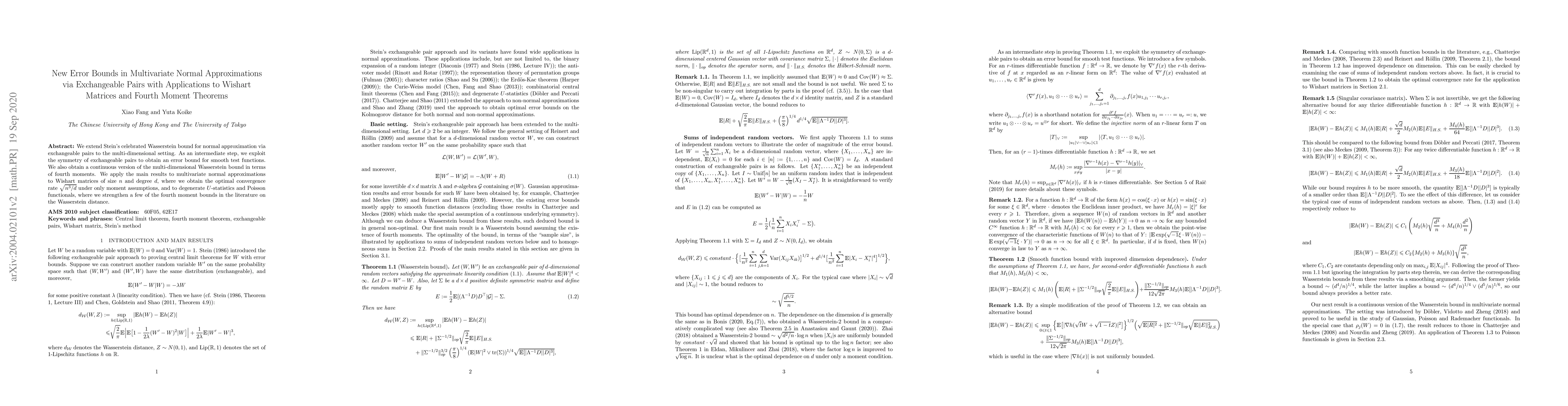 We extend Stein's celebrated Wasserstein bound for normal approximation via exchangeable pairs to the multi-dimensional setting. As an intermediate step, we exploit the symmetry of exchangeable pairs to obtain an error bound for smooth test functions. We also obtain a continuous version of the multi-dimensional Wasserstein bound in terms of fourth moments. We apply the main results to multivariate normal approximations to Wishart matrices of size $n$ and degree $d$, where we obtain the optimal convergence rate $\sqrt{n^3/d}$ under only moment assumptions, and to quadratic forms and Poisson functionals, where we strengthen a few of the fourth moment bounds in the literature on the Wasserstein distance.