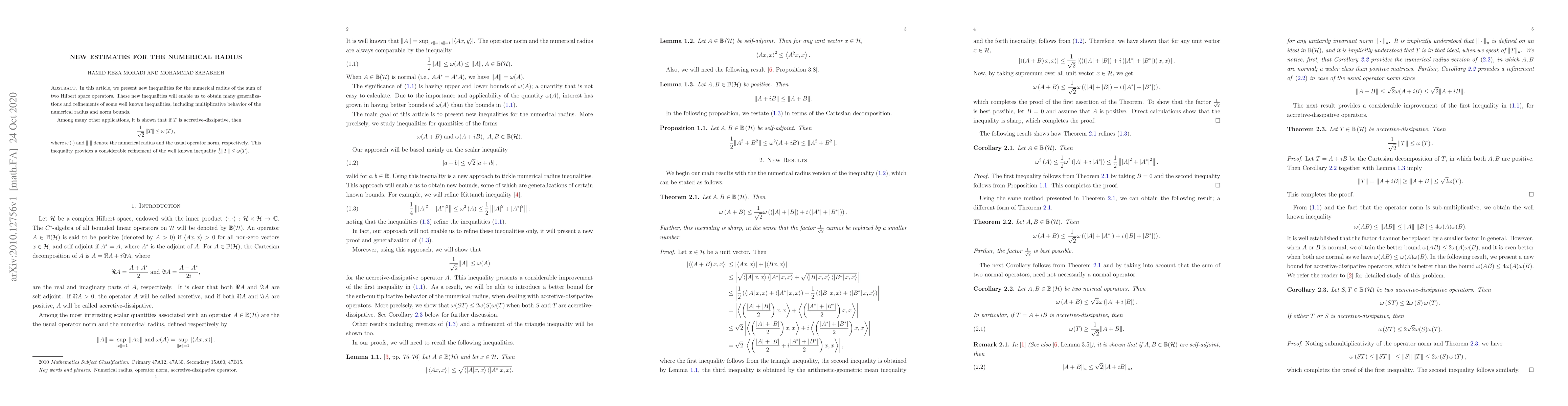 In this article, we present new inequalities for the numerical radius of the sum of two Hilbert space operators. These new inequalities will enable us to obtain many generalizations and refinements of some well known inequalities, including multiplicative behavior of the numerical radius and norm bounds. Among many other applications, it is shown that if $T$ is accretive-dissipative, then \[\frac{1}{\sqrt{2}}\left\| T \right\|\le \omega \left( T \right),\] where $\omega \left( \cdot \right)$ and $\left\| \cdot \right\|$ denote the numerical radius and the usual operator norm, respectively. This inequality provides a considerable refinement of the well known inequality $\frac{1}{2}\|T\|\leq \omega(T).$