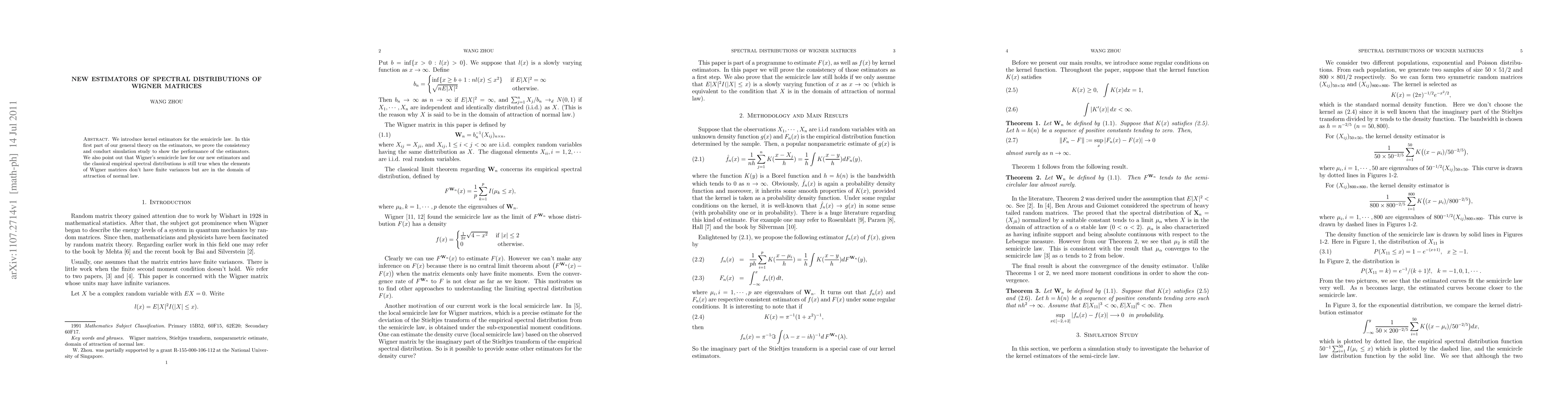 We introduce kernel estimators for the semicircle law. In this first part of our general theory on the estimators, we prove the consistency and conduct simulation study to show the performance of the estimators. We also point out that Wigner's semicircle law for our new estimators and the classical empirical spectral distributions is still true when the elements of Wigner matrices don't have finite variances but are in the domain of attraction of normal law.