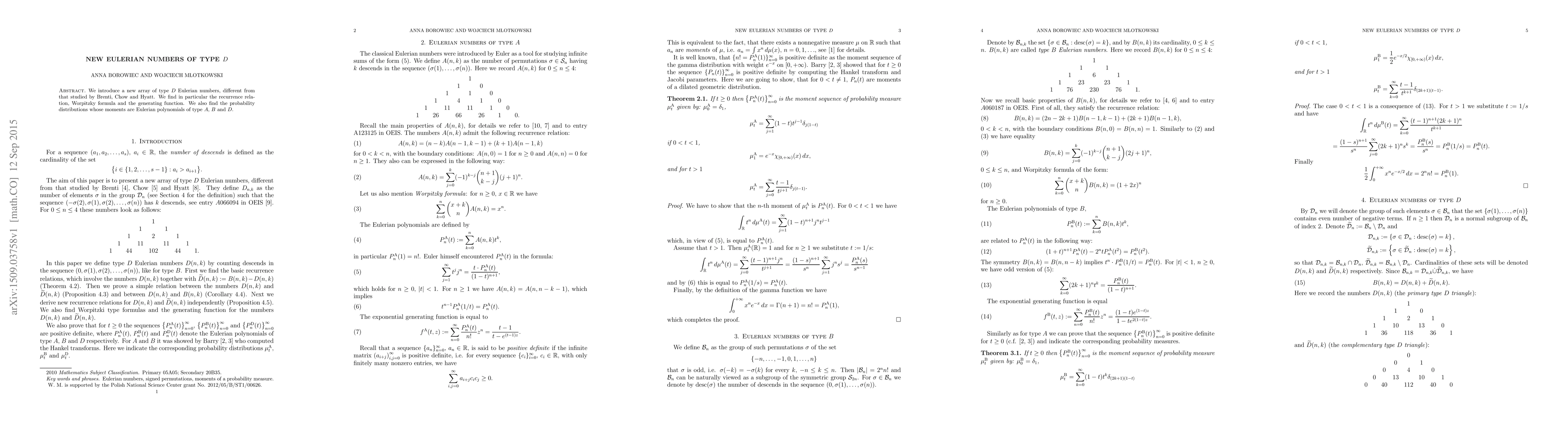We introduce a new array of type $D$ Eulerian numbers, different from that studied by Brenti, Chow and Hyatt. We find in particular the recurrence relation, Worpitzky formula and the generating function. We also find the probability distributions whose moments are Eulerian polynomials of type $A$, $B$ and $D$.