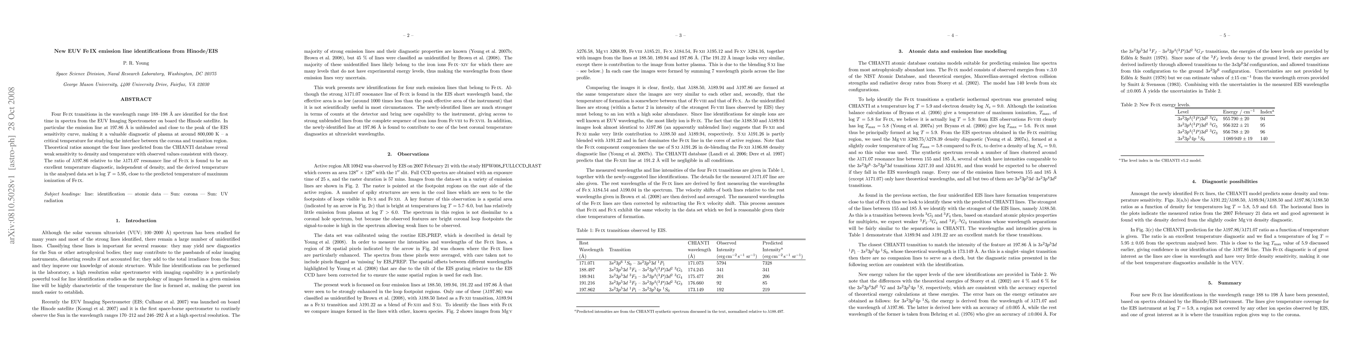 This paper identifies four new Fe IX emission lines in the EUV range from Hinode/EIS observations, with a focus on the unblended 197.86 Å line, which is crucial for diagnosing plasma at 800,000 K. The derived temperature of log T=5.95 aligns closely with theoretical predictions, highlighting the line's potential as an independent temperature diagnostic.