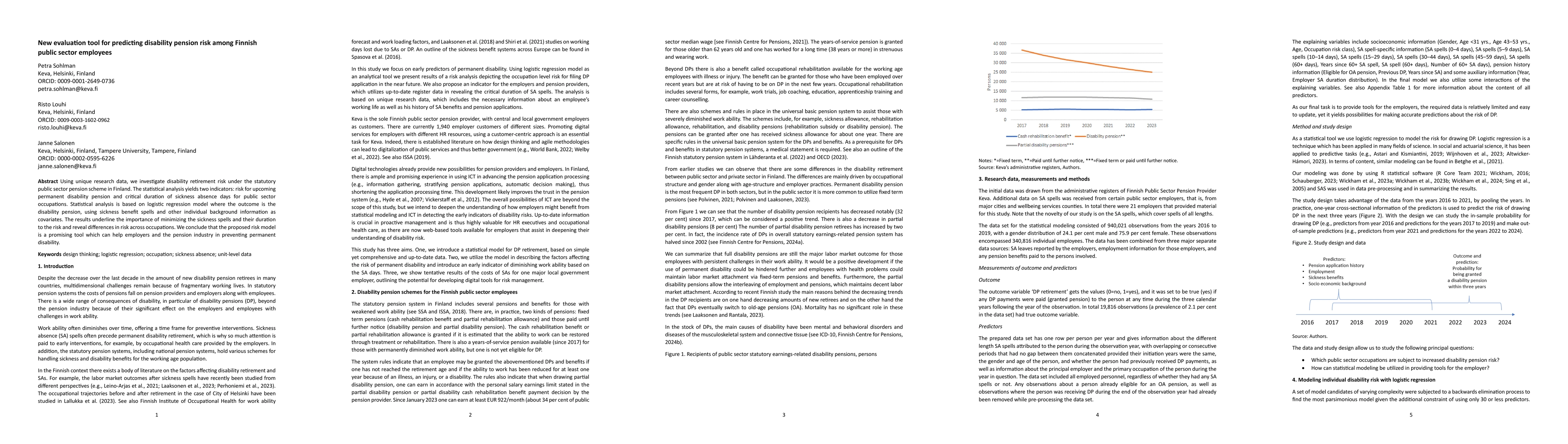 This study develops a new evaluation tool to predict disability pension risk among Finnish public sector employees, identifying key indicators such as the risk of permanent disability and critical sickness absence duration. The model uses logistic regression, highlighting the importance of reducing sickness spells and showing varying risks across different occupations.