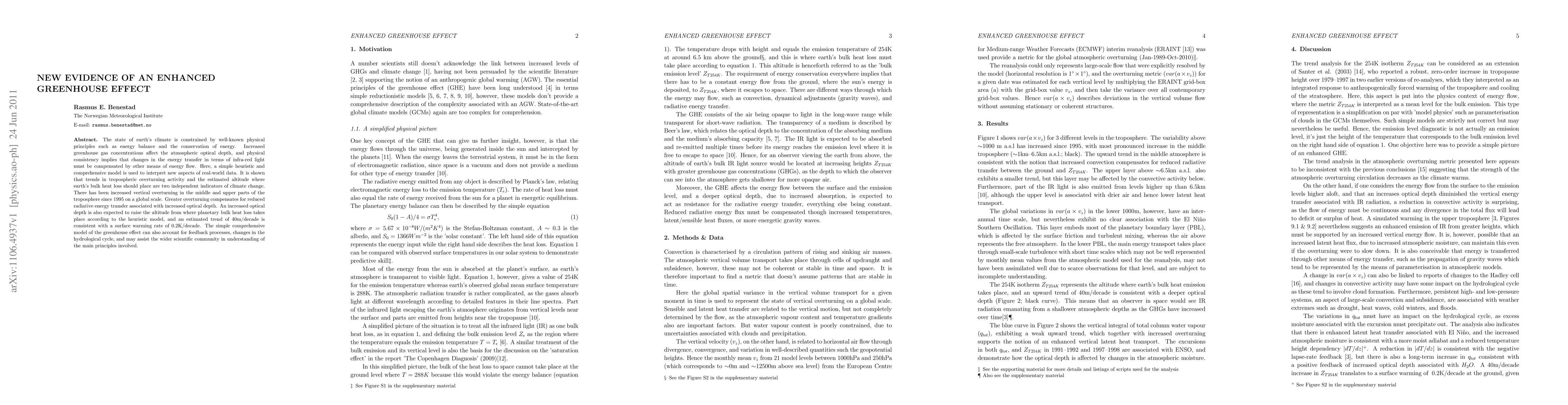 The state of earth's climate is constrained by well-known physical principles such as energy balance and the conservation of energy. Increased greenhouse gas concentrations affect the atmospheric optical depth, and physical consistency implies that changes in the energy transfer in terms of infra-red light must be compensated by other means of energy flow. Here, a simple heuristic and comprehensive model is used to interpret new aspects of real-world data. It is shown that trends in tropospheric overturning activity and the estimated altitude where earth's bulk heat loss should place are two independent indicators of climate change. There has been increased vertical overturning in the middle and upper parts of the troposphere since 1995 on a global scale. Greater overturning compensates for reduced radiative energy transfer associated with increased optical depth. An increased optical depth is also expected to raise the altitude from where planetary bulk heat loss takes place according to the heuristic model, and an estimated trend of 40m/decade is consistent with a surface warming rate of 0.2K/decade. The simple comprehensive model of the greenhouse effect can also account for feedback processes, changes in the hydrological cycle, and may assist the wider scientific community in understanding of the main principles involved.