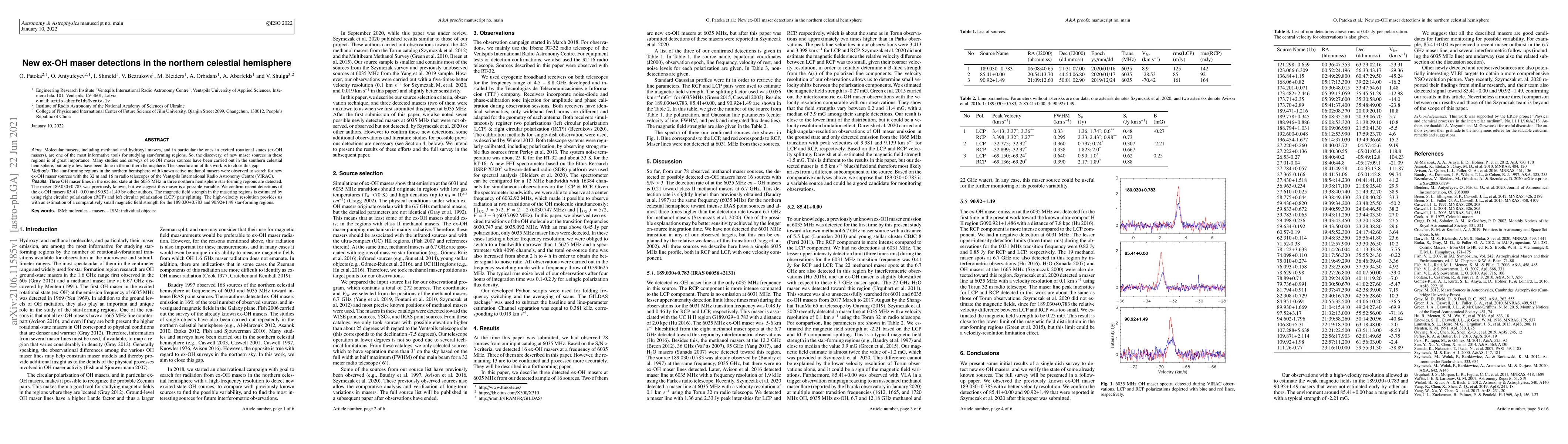Aims.Molecular masers, including methanol and hydroxyl masers, and in particular the ones in excited rotational states (ex-OHmasers), are one of the most informative tools for studying star-forming regions. So, the discovery, of new maser sources in theseregions is of great importance. Many studies and surveys of ex-OH maser sources have been carried out in the southern celestialhemisphere, but only a few have been done in the northern hemisphere. The specific aim of this work is to close this gap.Methods.The star-forming regions in the northern hemisphere with known active methanol masers were observed to search for newex-OH maser sources with the 32 m and 16 m radio telescopes of the Ventspils International Radio Astronomy Centre (VIRAC).Results.Three OH maser lines in the excited state at the 6035 MHz in three northern hemisphere star-forming regions are detected.The maser 189.030+0.783 was previously known, but we suggest this maser is a possible variable. We confirm recent detections ofthe ex-OH masers 85.41+0.00 and 90.92+1.49 by other authors. The magnetic field strength in the masering regions is estimated byusing right circular polarization (RCP) and left circular polarization (LCP) pair splitting. The high-velocity resolution provides uswith an estimation of a comparatively small magnetic field strength for the 189.030+0.783 and 90.92+1.49 star-forming regions