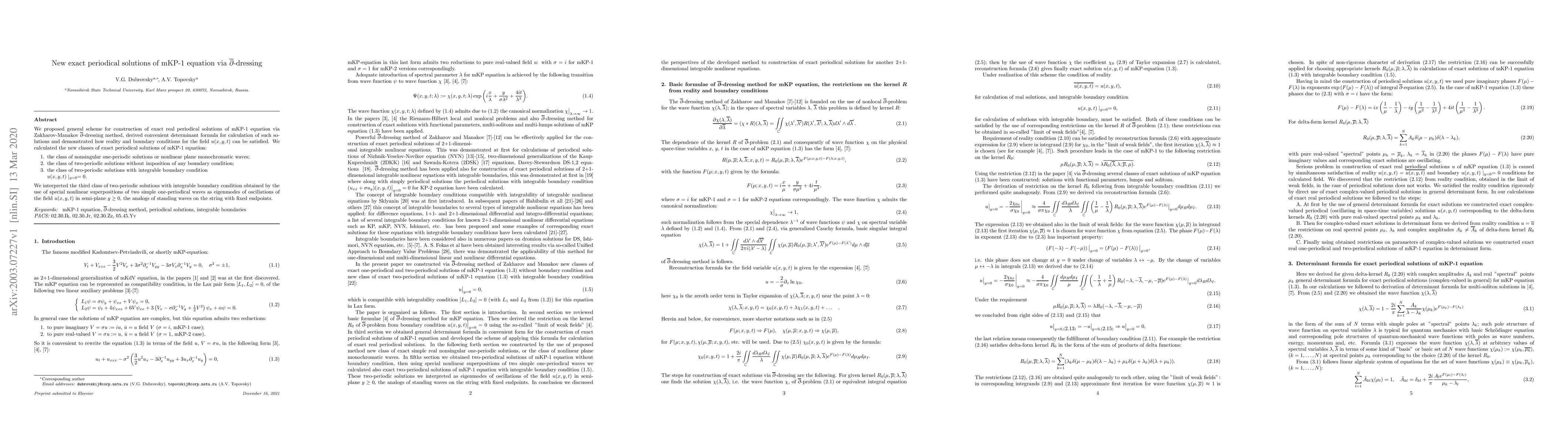 This paper introduces a general scheme for finding exact real periodic solutions of the modified Kadomtsev-Petviashvili (mKP-1) equation using the Zakharov-Manakov $\overline{\partial}$-dressing method. It provides a determinant formula for calculating these solutions and explores three classes of exact periodic solutions, including one-periodic, two-periodic without boundary conditions, and two-periodic with a specific integrable boundary condition.
