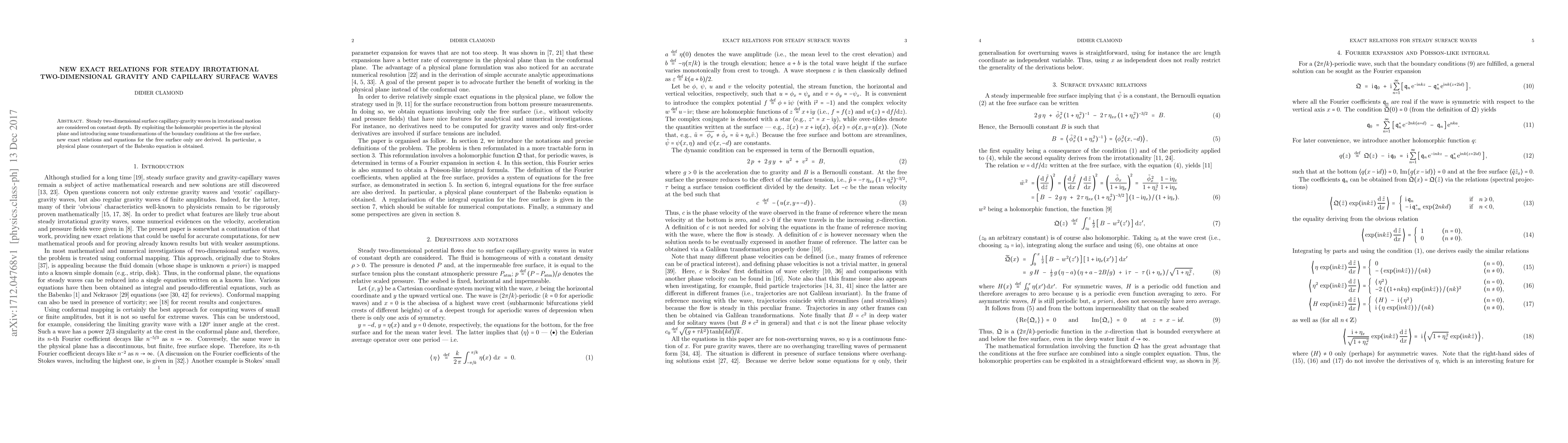 The research derives exact relations for steady irrotational two-dimensional gravity and capillary surface waves using holomorphic properties and transformations of boundary conditions at the free surface in the physical plane.