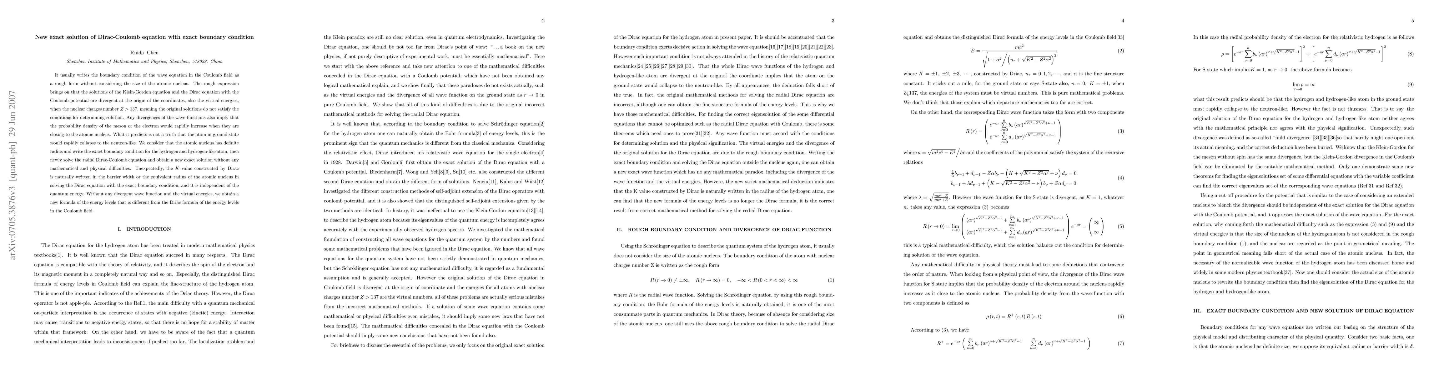 This paper presents a new exact solution to the Dirac-Coulomb equation by incorporating an exact boundary condition that considers the atomic nucleus's finite radius, resolving divergence issues and yielding a novel formula for energy levels differing from traditional Dirac formulas.