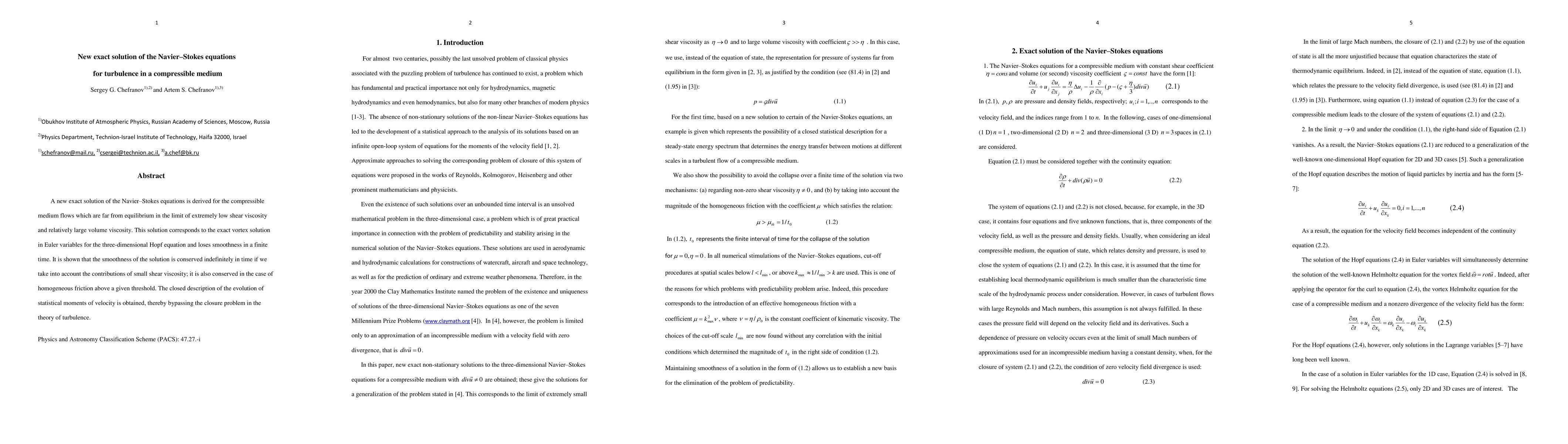 This paper presents a new exact solution to the Navier-Stokes equations for turbulence in compressible media under conditions of low shear viscosity and high volume viscosity. It provides a closed description of the evolution of velocity statistical moments, effectively resolving the closure problem in turbulence theory.