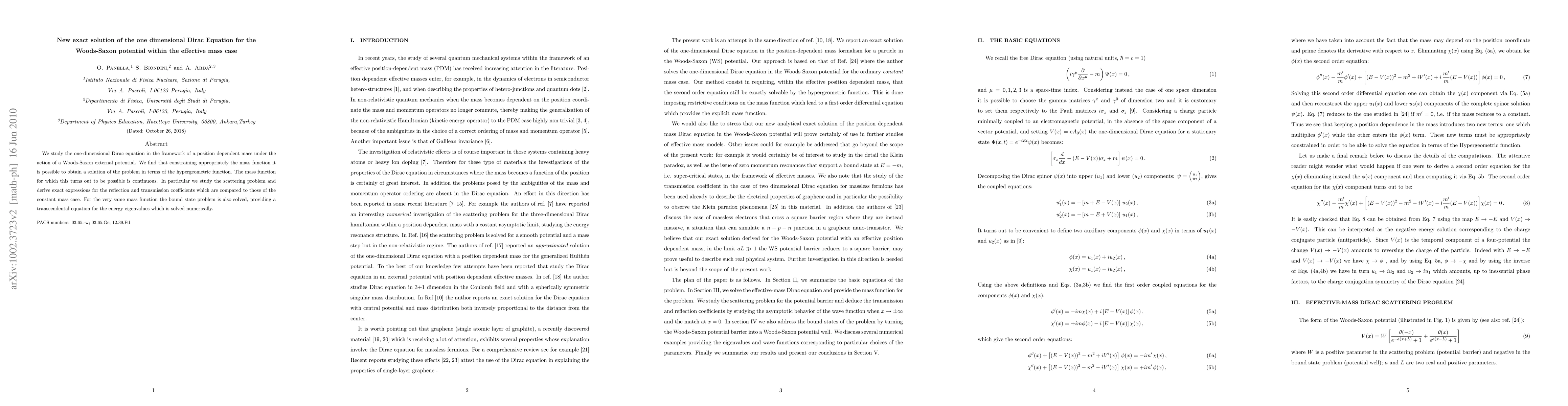 We study the one-dimensional Dirac equation in the framework of a position dependent mass under the action of a Woods-Saxon external potential. We find that constraining appropriately the mass function it is possible to obtain a solution of the problem in terms of the hypergeometric function. The mass function for which this turns out to be possible is continuous. In particular we study the scattering problem and derive exact expressions for the reflection and transmission coefficients which are compared to those of the constant mass case. For the very same mass function the bound state problem is also solved, providing a transcendental equation for the energy eigenvalues which is solved numerically.