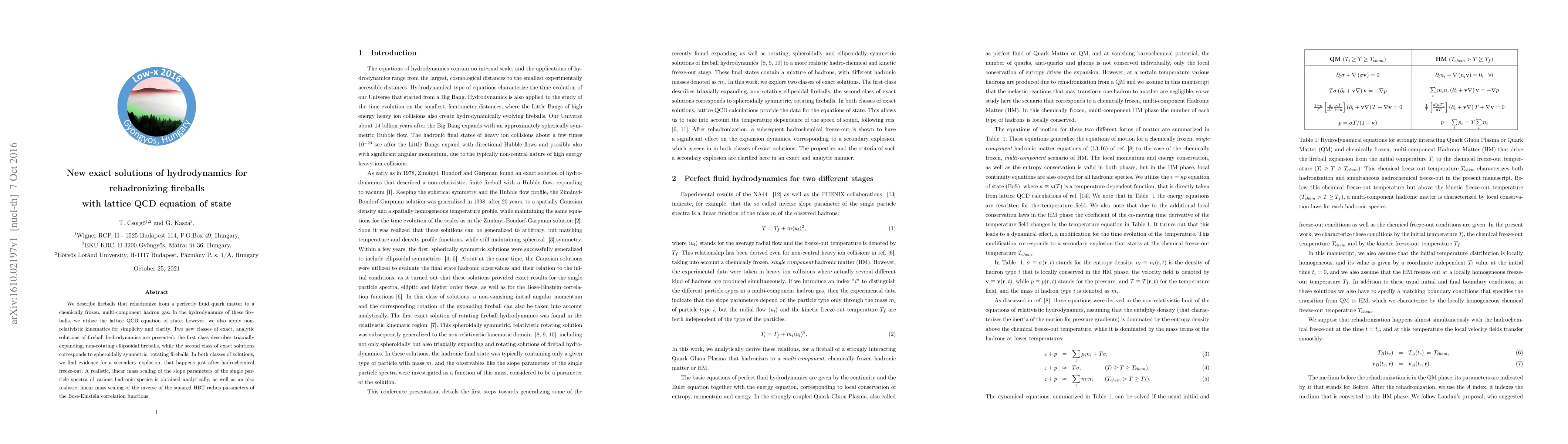 This paper presents two new classes of exact, analytic solutions for hydrodynamics of fireballs transitioning from quark matter to hadron gas, using a lattice QCD equation of state. The solutions describe triaxially expanding ellipsoidal and rotating spheroidally symmetric fireballs, revealing a secondary explosion post-hadrochemical freeze-out and providing realistic mass scaling for particle spectra and Bose-Einstein correlation functions.