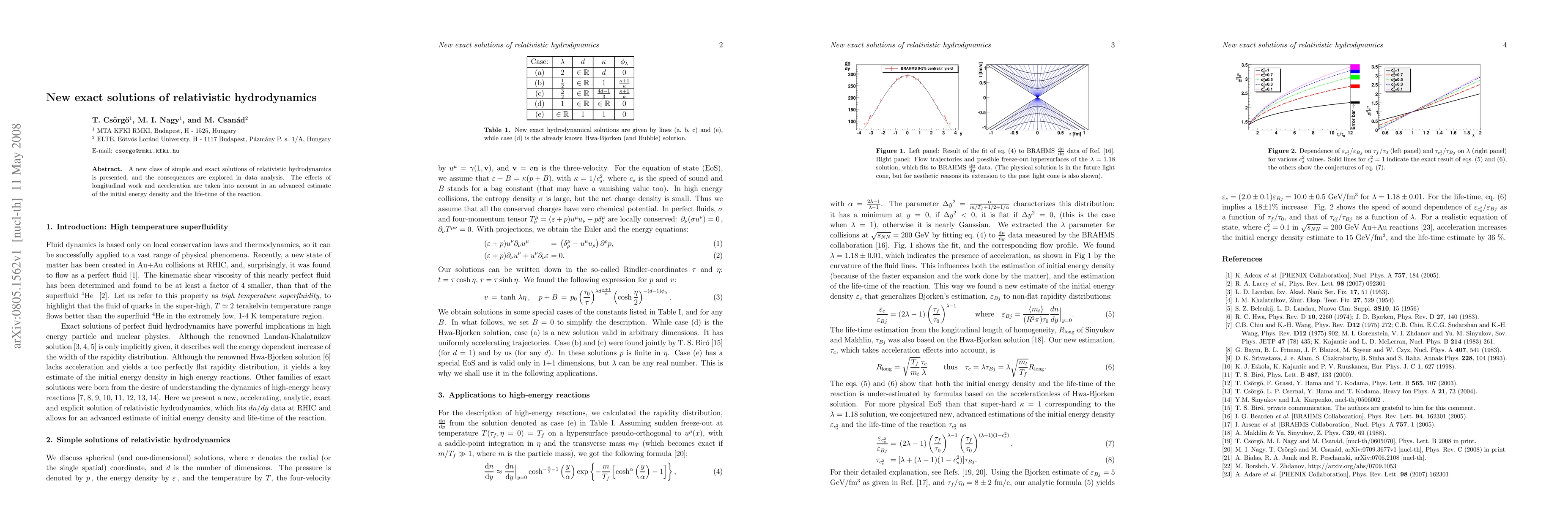 A new class of simple and exact solutions of relativistic hydrodynamics is presented, and the consequences are explored in data analysis. The effects of longitudinal work and acceleration are taken into account in an advanced estimate of the initial energy density and the life-time of the reaction.