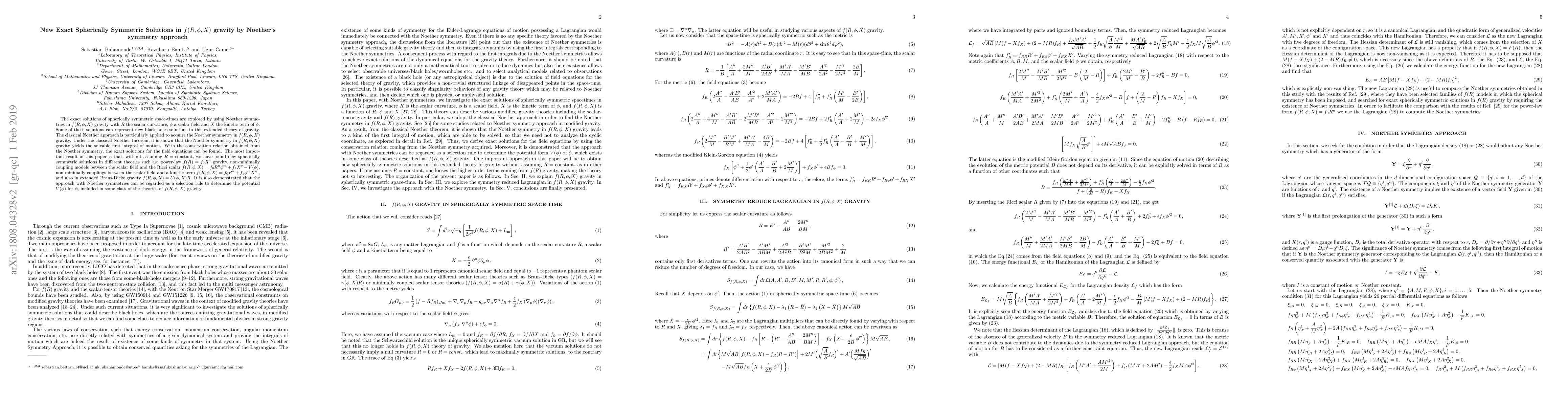 This paper utilizes Noether symmetries to find exact spherically symmetric solutions in $f(R,\phi,X)$ gravity, uncovering new black hole solutions without assuming constant scalar curvature. It demonstrates the effectiveness of the Noether symmetry approach to derive solvable first integrals and select potentials for the scalar field $\phi$.