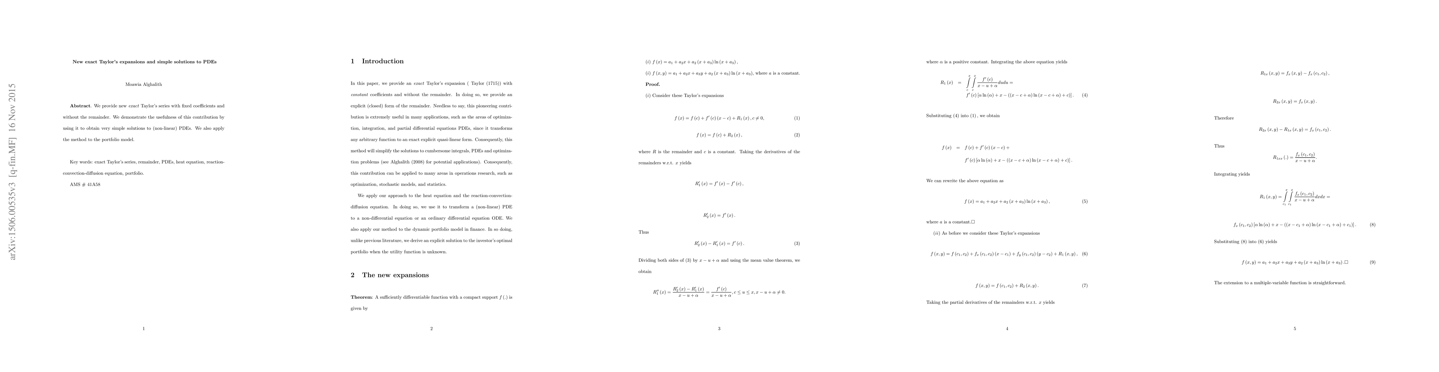 We provide new exact Taylor's series with fixed coefficients and without the remainder. We demonstrate the usefulness of this contribution by using it to obtain very simple solutions to (non-linear) PDEs. We also apply the method to the portfolio model.