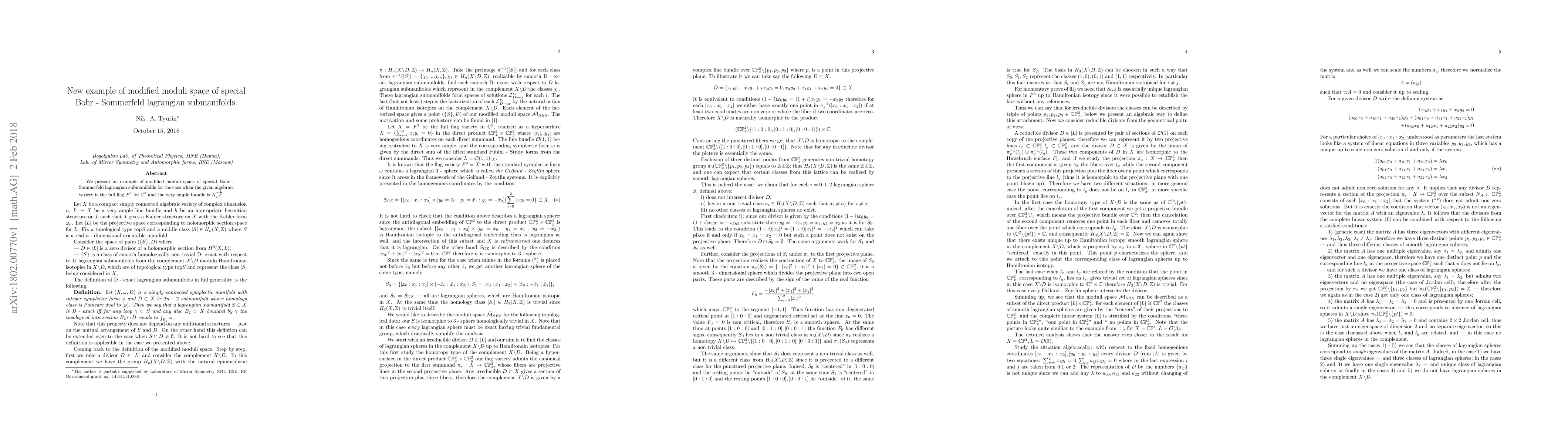We present an example of modified moduli space of special Bohr - Sommerfeld lagrangian submanifolds for the case when the given algebraic variety is the full flag $F^3$ for $\mathbb{C}^3$ and the very ample bundle is $K^{- \frac{1}{2}}_{F^3}$