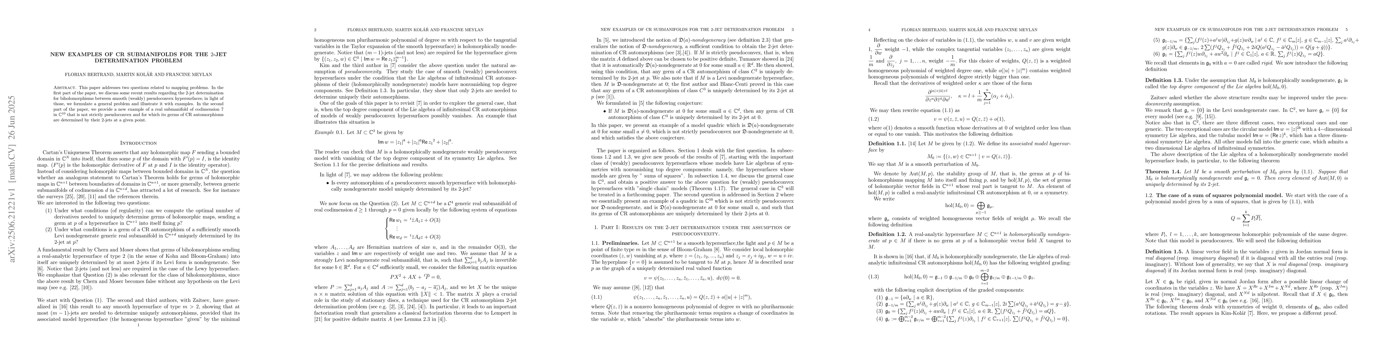 The paper introduces explicit examples of CR submanifolds with nontrivial symmetry properties that exhibit 2-jet automorphism determination, including new techniques for analyzing stationary discs and polynomial models.