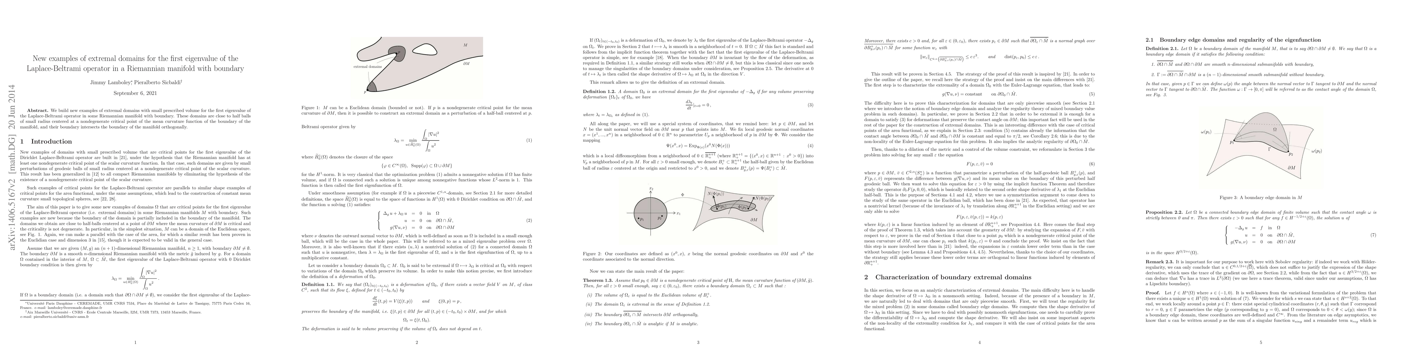 Summary: This paper introduces novel extremal domains with minimal volume that maximize the first eigenvalue of the Laplace-Beltrami operator in specific Riemannian manifolds with boundaries, resembling small half-balls near critical mean curvature points with orthogonal boundary intersections.