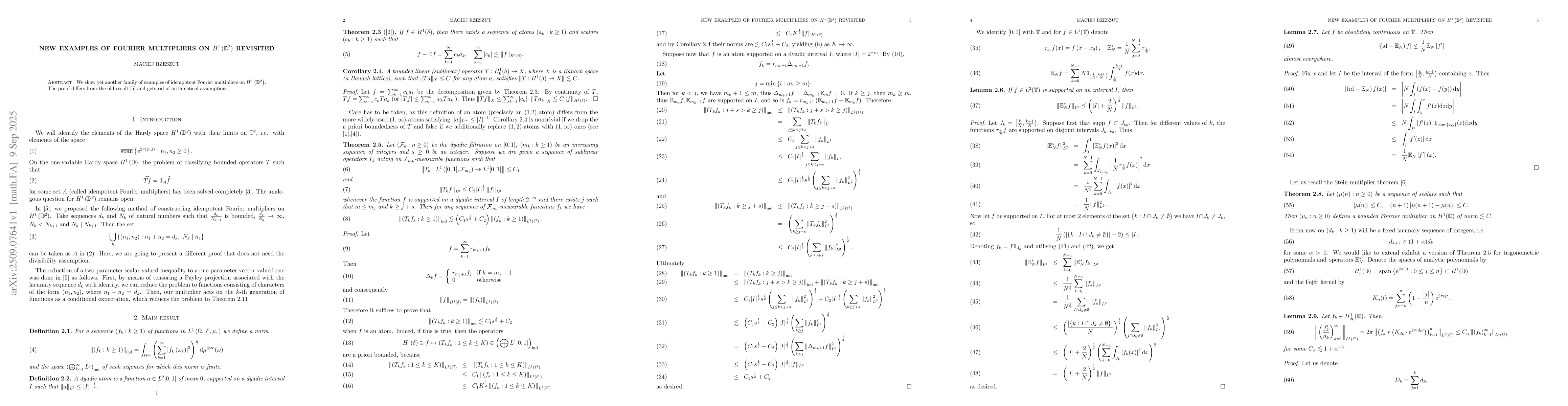 We show yet another family of examples of idempotent Fourier multipliers on $H^1\p{\mathbb{D}^2}$. The proof differs from our previous result and gets rid of arithmetical assumptions.