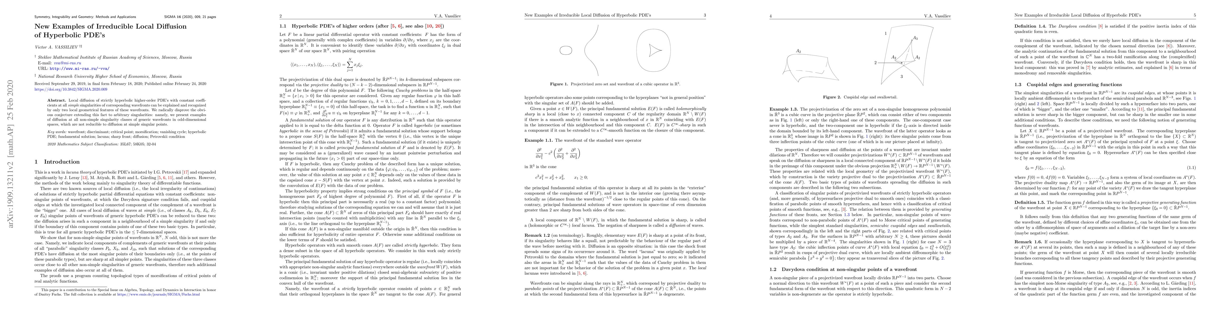 Local diffusion of strictly hyperbolic higher-order PDE's with constant coefficients at all simple singularities of corresponding wavefronts can be explained and recognized by only two local geometrical features of these wavefronts. We radically disprove the obvious conjecture extending this fact to arbitrary singularities: namely, we present examples of diffusion at all non-simple singularity classes of generic wavefronts in odd-dimensional spaces, which are not reducible to diffusion at simple singular points.
