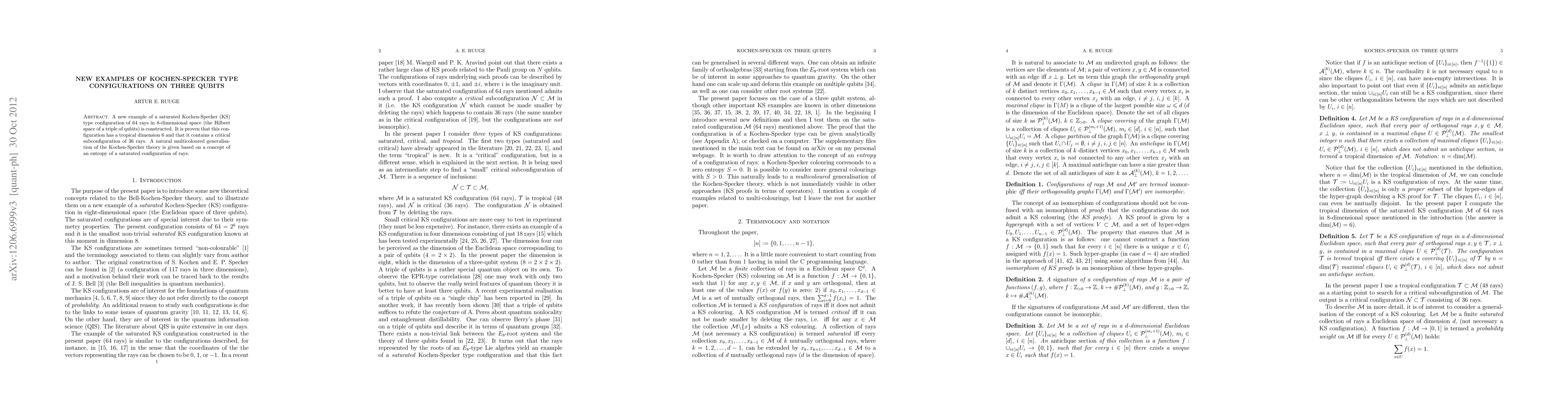 A new example of a saturated Kochen-Specker (KS) type configuration of 64 rays in 8-dimensional space (the Hilbert space of a triple of qubits) is constructed. It is proven that this configuration has a tropical dimension 6 and that it contains a critical subconfiguration of 36 rays. A natural multicolored generalisation of the Kochen-Specker theory is given based on a concept of an entropy of a saturated configuration of rays.
