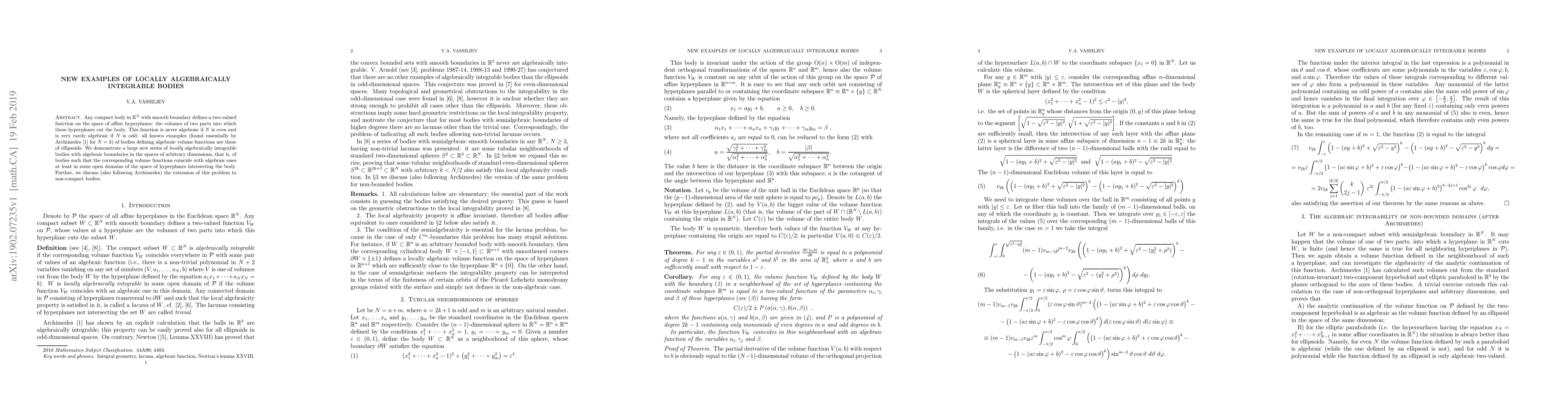 This paper introduces a new series of locally algebraically integrable bodies in arbitrary dimensions, extending beyond ellipsoids, and discusses the rare occurrence of algebraic volume functions for compact bodies, with a focus on both compact and non-compact cases.