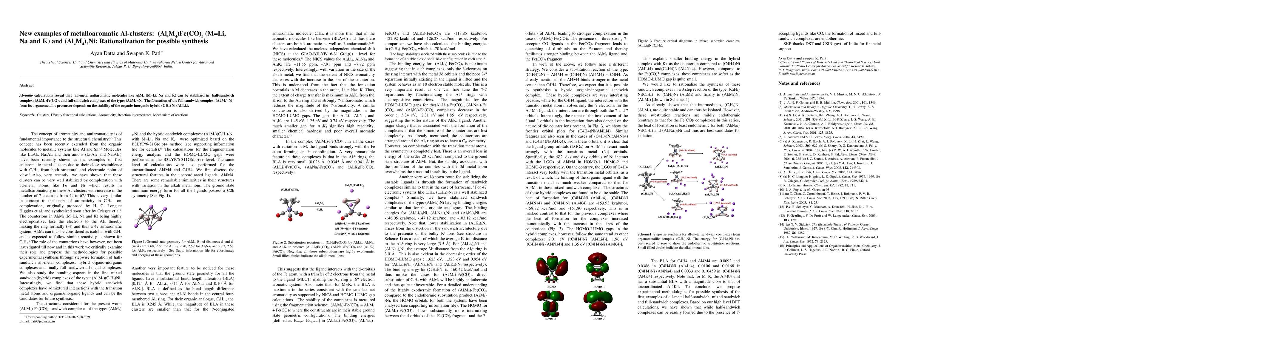 Two-line summary: Ab-initio calculations demonstrate that antiaromatic Al4M4 clusters (M=Li, Na, K) can be stabilized in half-sandwich Fe(CO)3 and full-sandwich Ni complexes, suggesting a feasible synthesis route through the hybrid precursor (C4H4)Ni(Al4Li4). The stability of these complexes is rationalized through detailed electronic structure analysis.