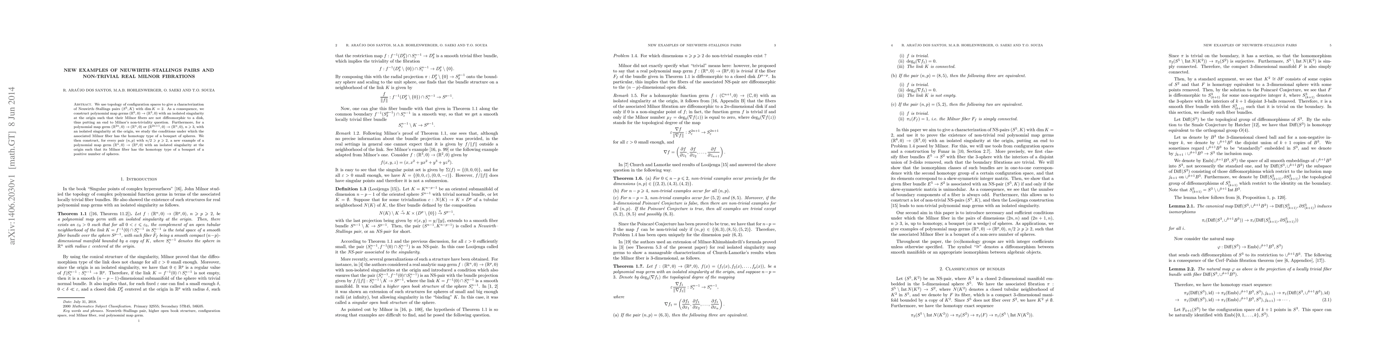 We use topology of configuration spaces to give a characterization of Neuwirth--Stallings pairs $(S^5, K)$ with $\dim K = 2$. As a consequence, we construct polynomial map germs $(\mathbb{R}^{6},0)\to (\mathbb{R}^{3},0)$ with an isolated singularity at the origin such that their Milnor fibers are not diffeomorphic to a disk, thus putting an end to Milnor's non-triviality question. Furthermore, for a polynomial map germ $(\mathbb{R}^{2n},0) \to (\mathbb{R}^{n},0)$ or $(\mathbb{R}^{2n+1},0) \to (\mathbb{R}^{n},0)$, $n \geq 3$, with an isolated singularity at the origin, we study the conditions under which the associated Milnor fiber has the homotopy type of a bouquet of spheres. We then construct, for every pair $(n, p)$ with $n/2 \geq p \geq 2$, a new example of a polynomial map germ $(\mathbb{R}^n,0) \to (\mathbb{R}^p,0)$ with an isolated singularity at the origin such that its Milnor fiber has the homotopy type of a bouquet of a positive number of spheres.