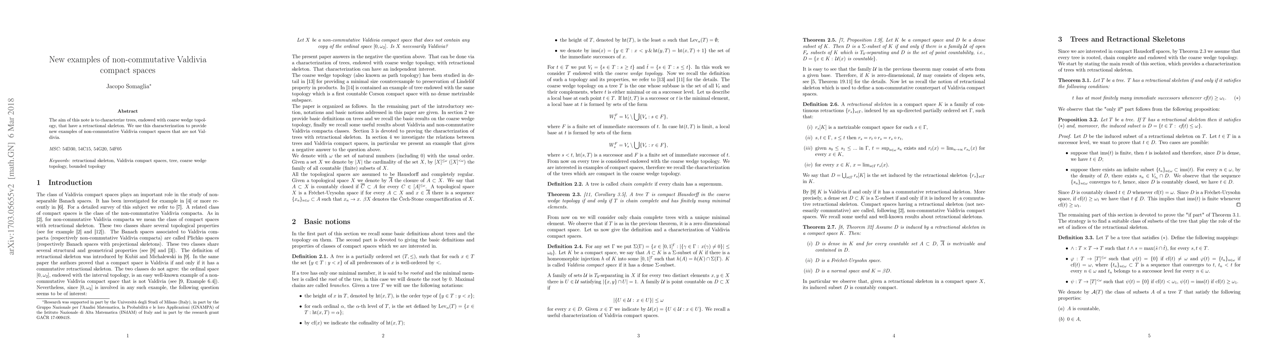Summary: This paper characterizes trees with coarse wedge topology that have a retractional skeleton, using this characterization to introduce new examples of non-commutative Valdivia compact spaces that do not fit the traditional Valdivia definition.