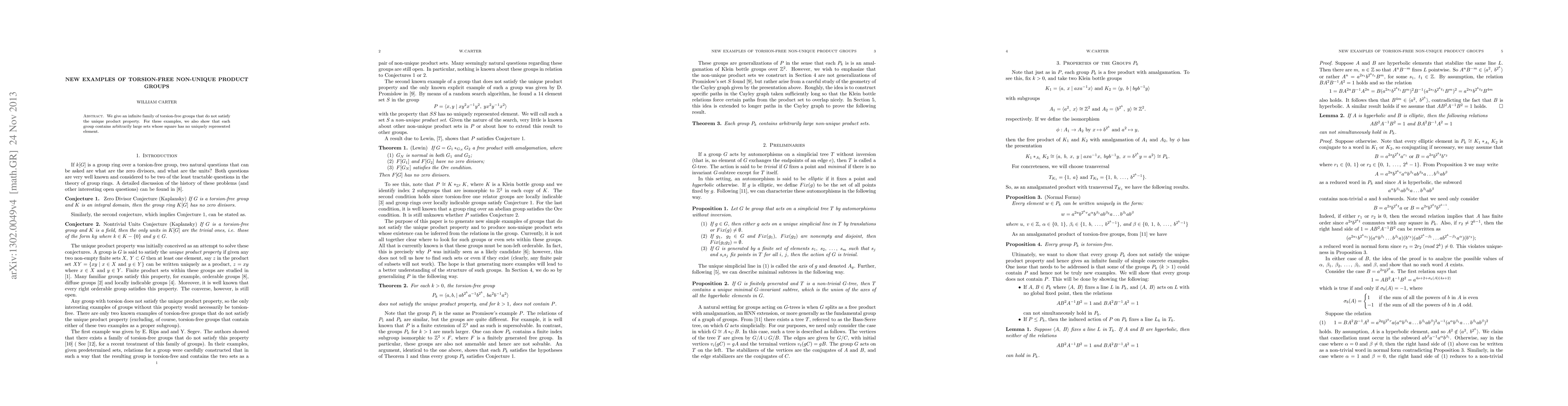 This paper presents an infinite family of torsion-free groups lacking the unique product property, and demonstrates that these groups contain large subsets whose squares do not have uniquely represented elements.