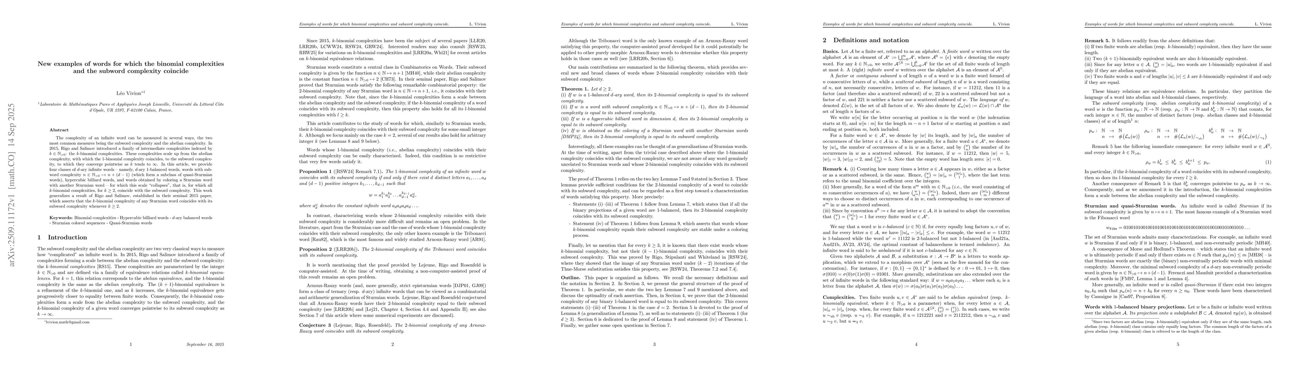 The research employs combinatorial analysis on words, focusing on binomial complexity and equivalence classes. It uses substitution methods, properties of Sturmian words, and algebraic structures to analyze the behavior of word sequences.