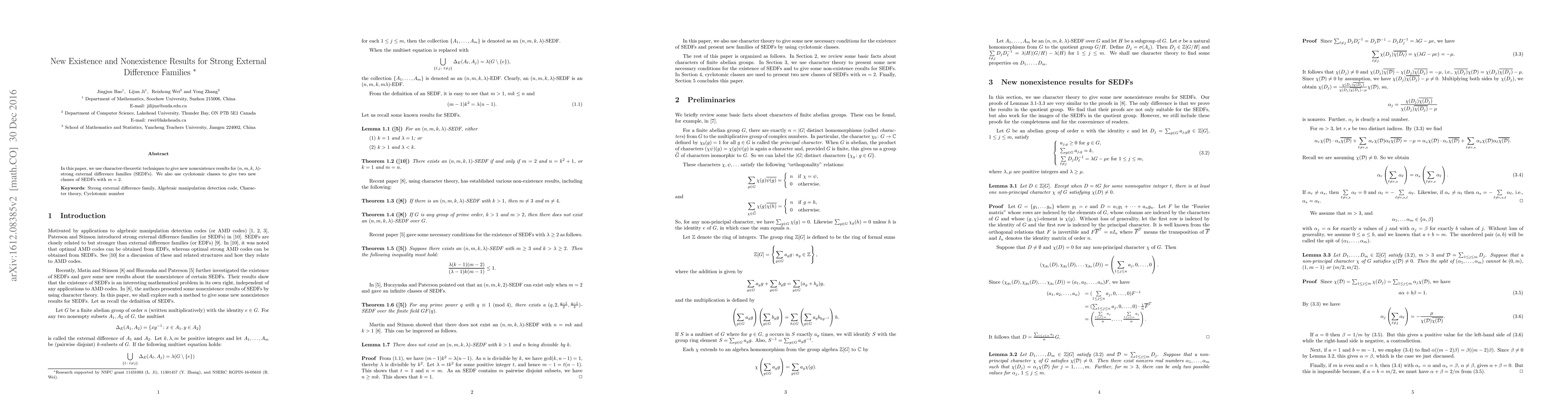 Summary: This paper employs character-theoretic methods to establish new nonexistence results for $(n,m,k,\lambda)$-strong external difference families (SEDFs) and identifies two new classes of SEDFs with $m=2$ using cyclotomic classes.