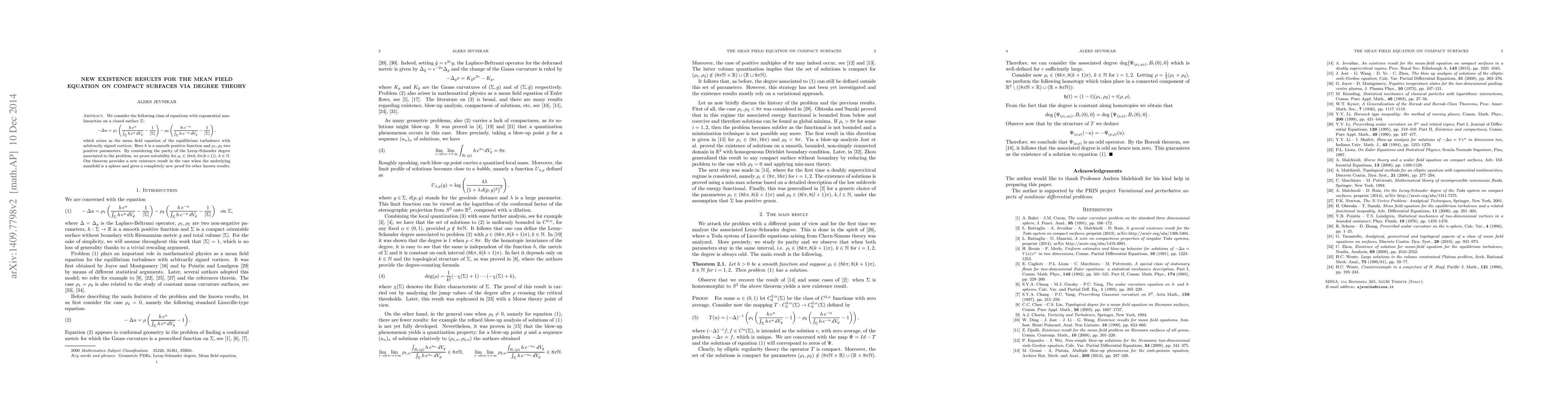 We consider a class of equations with exponential non-linearities on a compact surface which arises as the mean field equation of the equilibrium turbulence with arbitrarily signed vortices. We prove an existence result via degree theory. This yields new existence results in case of a topological sphere. The proof is carried out by considering the parity of the Leray-Schauder degree associated to the problem. With this method we recover also some known previous results.