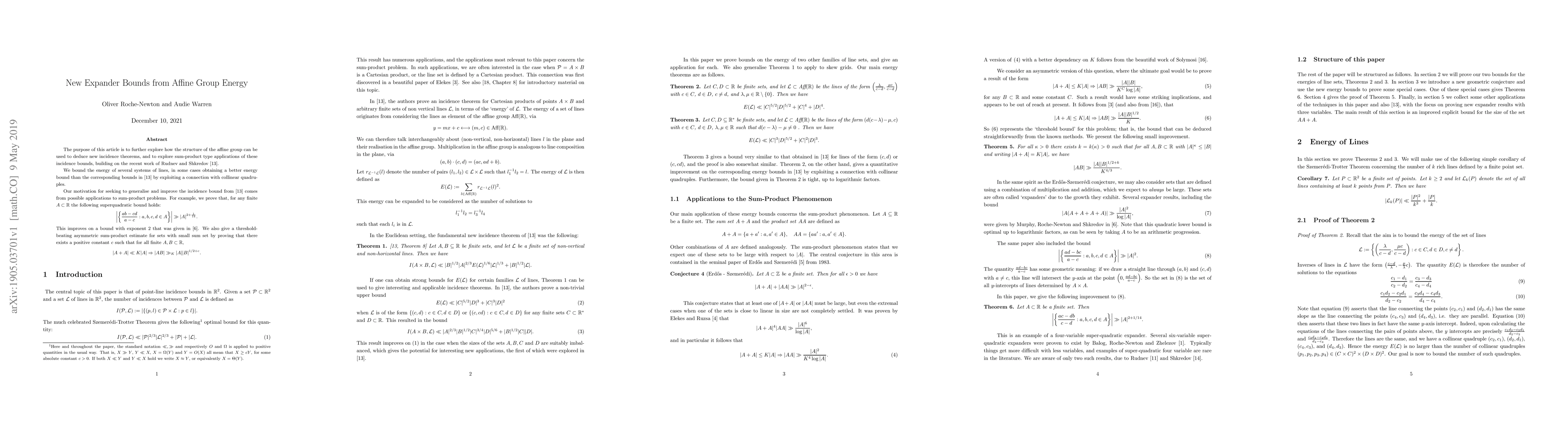 The purpose of this article is to further explore how the structure of the affine group can be used to deduce new incidence theorems, and to explore sum-product type applications of these incidence bounds, building on the recent work of Rudnev and Shkredov. We bound the energy of several systems of lines, in some cases obtaining a better energy bound than the corresponding bounds obtained by Rudnev and Shkredov by exploiting a connection with collinear quadruples. Our motivation for seeking to generalise and improve the incidence bound obtained by Rudnev and Shkredov comes from possible applications to sum-product problems. For example, we prove that, for any finite $A \subset \mathbb R$ the following superquadratic bound holds: \[ \left| \left \{ \frac{ab-cd}{a-c} : a,b,c,d \in A \right \} \right| \gg |A|^{2+\frac{1}{14}}. \] This improves the previously known bound with exponent $2$. We also give a threshold-beating asymmetric sum-product estimate for sets with small sum set by proving that there exists a positive constant $c$ such that for all finite $A,B \subset \mathbb R$, \[ |A+A| \ll K|A| \Rightarrow |AB| \gg_K |A||B|^{1/2+c}. \]