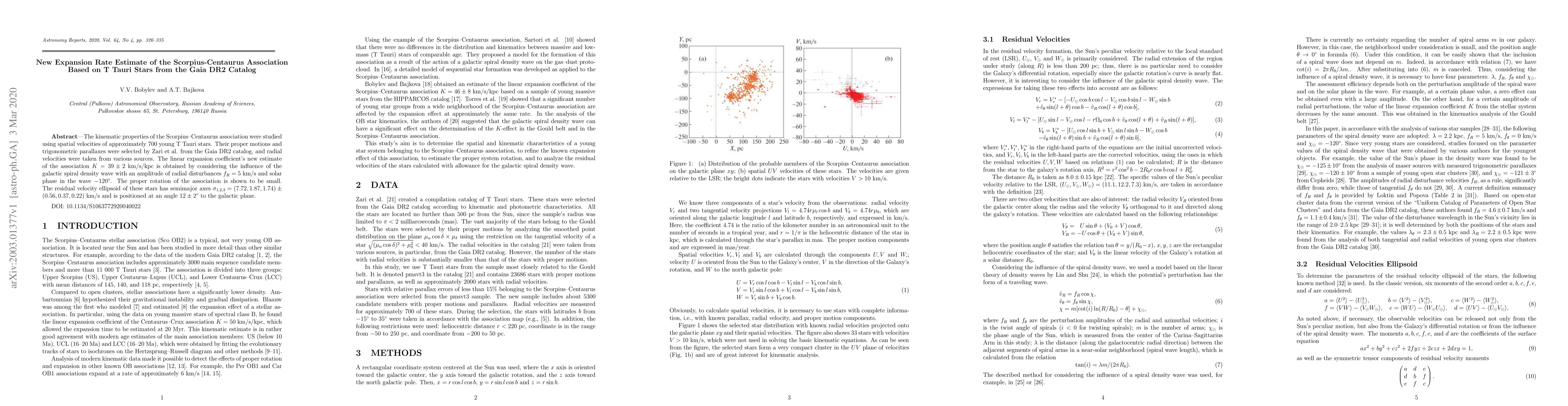 The kinematic properties of the Scorpius-Centaurus association were studied using spatial velocities of approximately 700 young T Tauri stars. Their proper motions and trigonometric parallaxes were selected by Zari et al. from the Gaia DR2 catalog, and radial velocities were taken from various sources. The linear expansion coefficients new estimate of the association $K=39\pm2$ km/s/kpc is obtained by considering the influence of the galactic spiral density wave with an amplitude of radial disturbances $f_R=5$ km/s and solar phase in the wave $-120^\circ$. The proper rotation of the association is shown to be small. The residual velocity ellipsoid of these stars has semimajor axes $\sigma_{1,2,3}=(7.72,1.87,1.74)\pm(0.56,0.37,0.22)$ km/s and is positioned at an angle $12\pm2^\circ$ to the galactic plane.