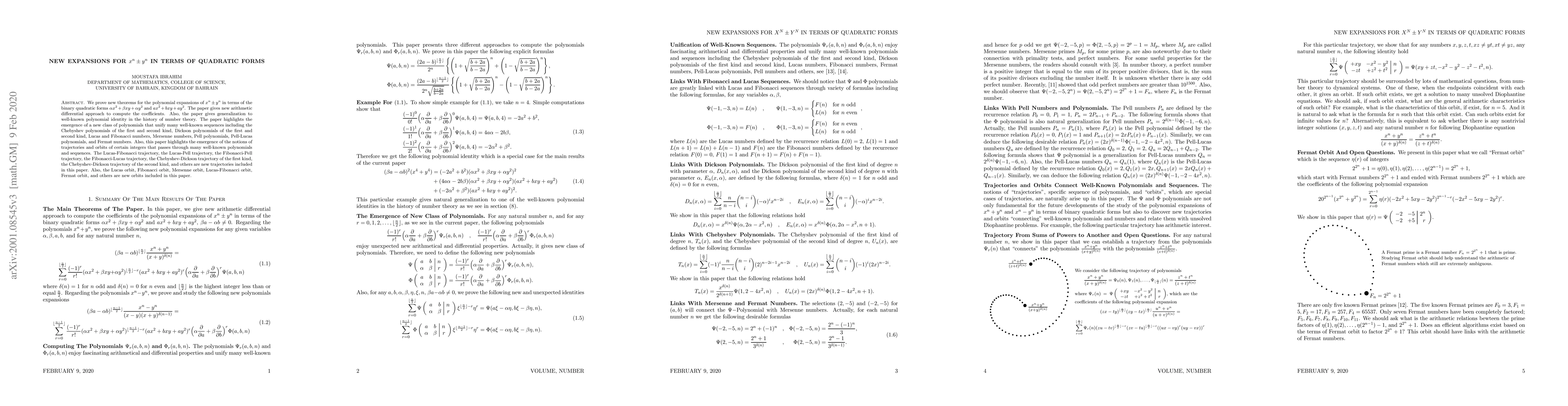 This paper introduces new expansions for $x^n m{+} y^n$ using quadratic forms and generalizes a well-known polynomial identity. It also reveals the emergence of new classes of polynomials and trajectories/orbits related to sequences like Chebyshev, Fibonacci, Lucas, and Fermat numbers.