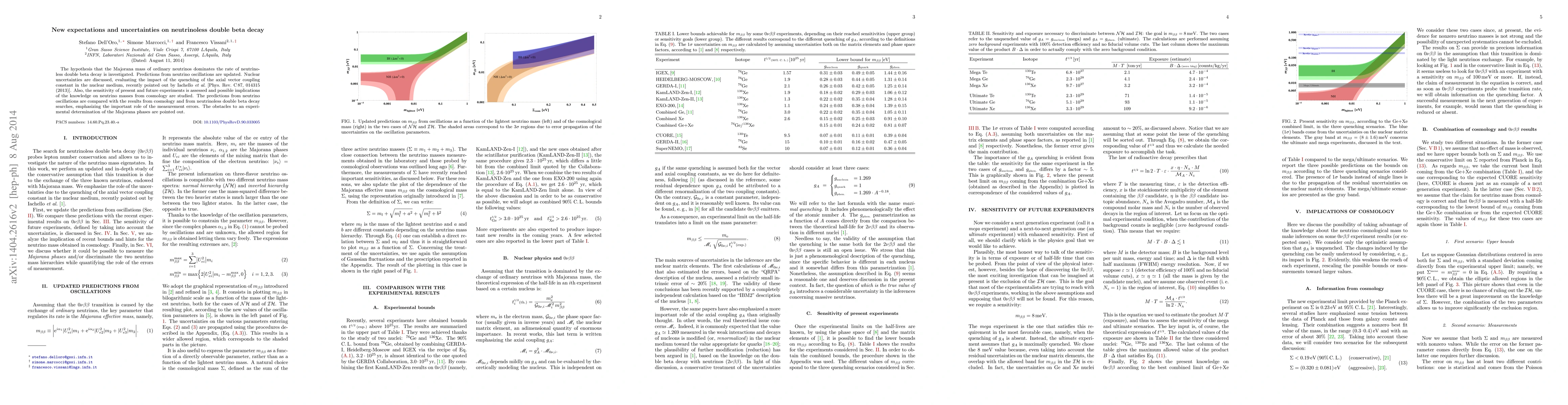 This paper investigates the hypothesis that Majorana neutrinos' mass governs neutrinoless double beta decay, updating predictions from neutrino oscillations and discussing nuclear uncertainties, especially the quenching of the axial vector coupling constant. It assesses the sensitivity of current and future experiments and explores the implications of cosmological neutrino mass measurements.