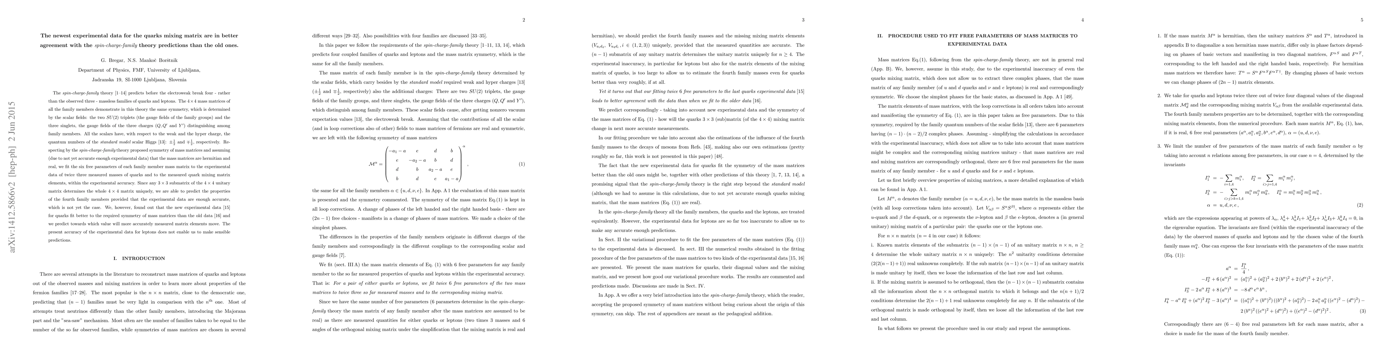 The spin-charge-family theory, predicting four quark families, aligns better with recent experimental data than previous data. The theory's symmetry in 4x4 mass matrices for family members, respecting standard model scalar Higgs quantum numbers, fits six free parameters to measured quark masses and mixing matrix elements, allowing predictions for fourth family members as experimental data improves.