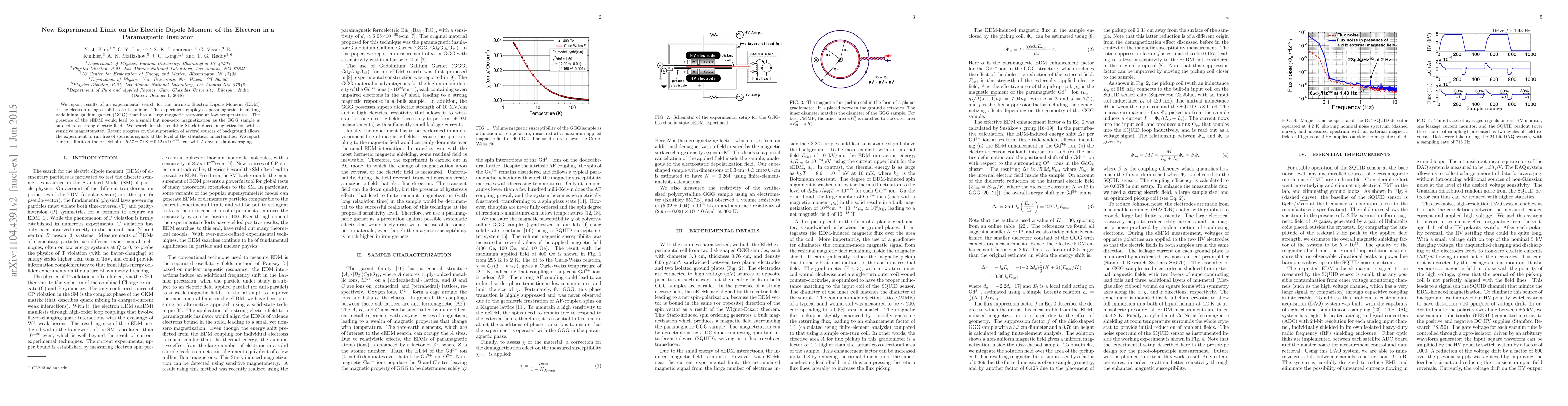 This paper reports an experimental search for the electron's intrinsic Electric Dipole Moment (eEDM) using a paramagnetic insulator, gadolinium gallium garnet (GGG), and a sensitive magnetometer. The study sets a new limit on the eEDM at $(-5.57 \pm 7.98 \pm 0.12)\times$10$^{-25}$e$\cdot$cm after suppressing background noise.