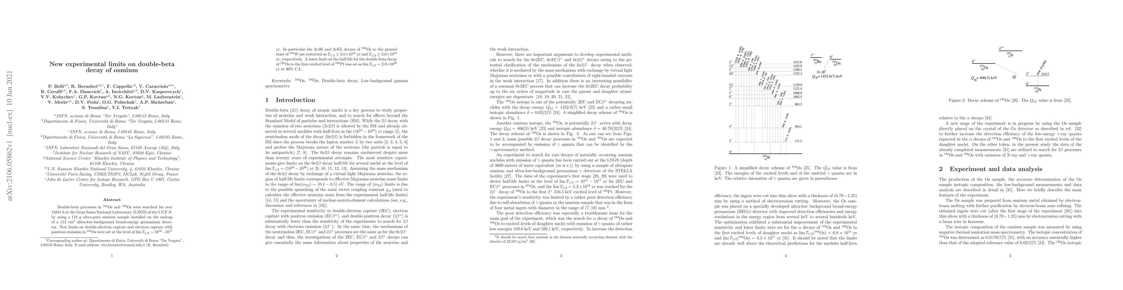 New experimental limits were set on double-beta decay processes in osmium isotopes $^{184}$Os and $^{192}$Os using an ultra-pure osmium sample and a germanium detector at Gran Sasso National Laboratory. The half-life for double-electron capture and electron capture with positron emission in $^{184}$Os was restricted to at least $3.0\times 10^{16}$ yr and $2.0\times 10^{16}$ yr, respectively. A lower limit of $2.0\times 10^{20}$ yr at 90% C.L. was established for the double-beta decay of $^{192}$Os to the first excited level of $^{192}$Pt.